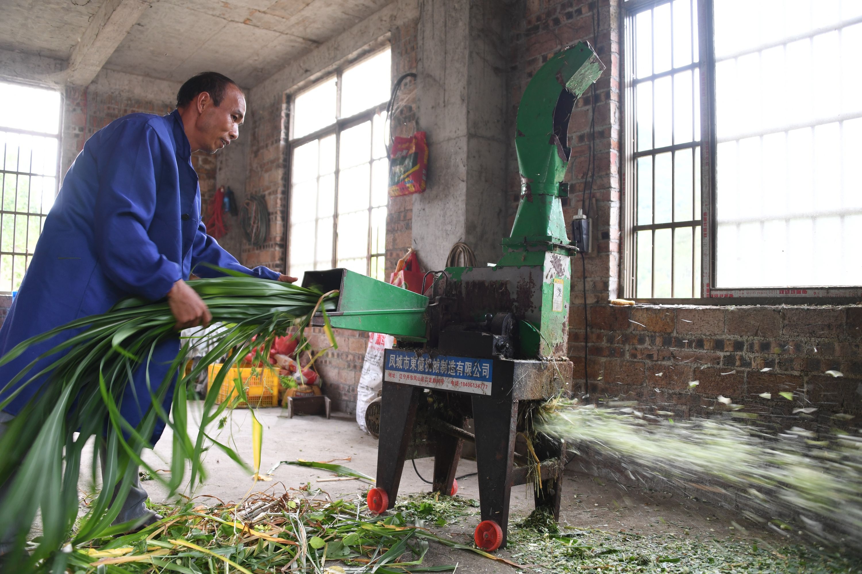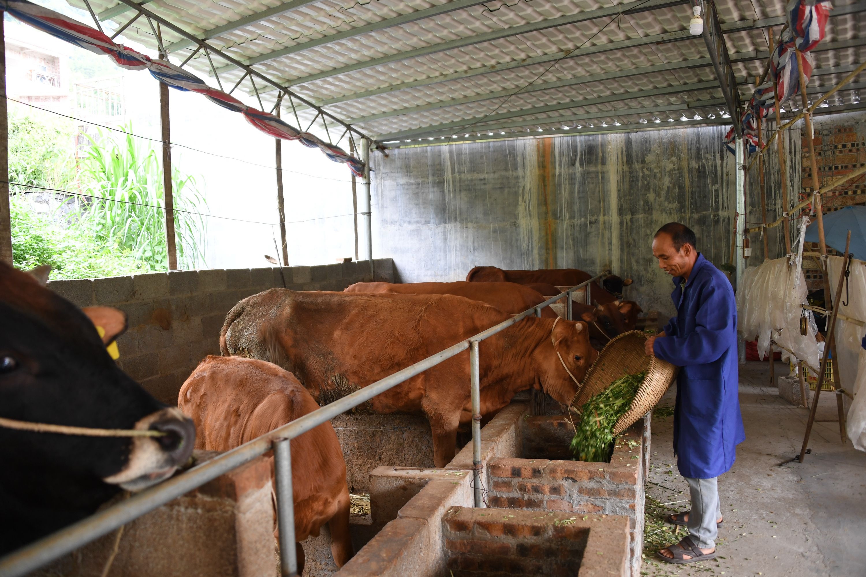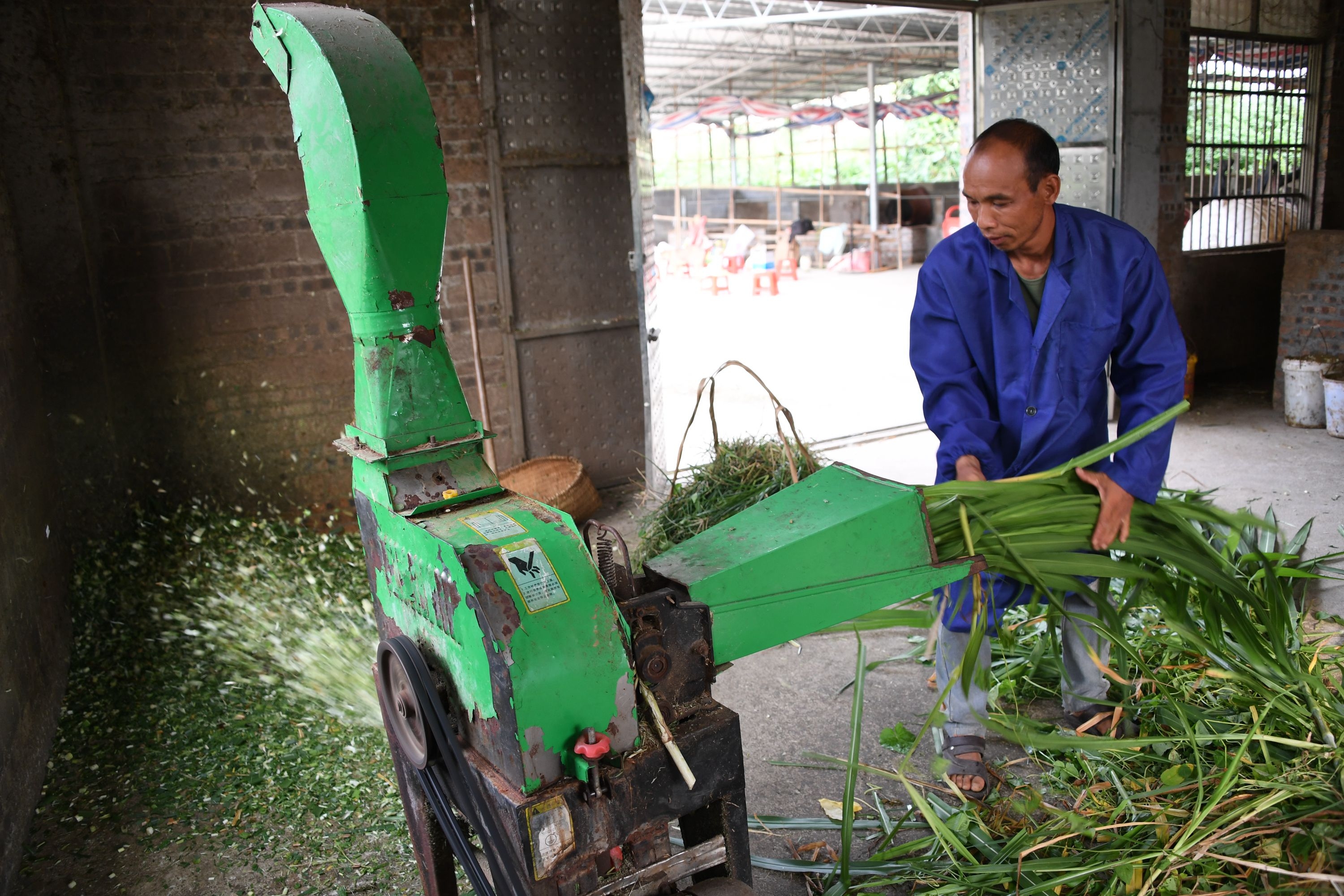 8月24日,罗城仫佬族自治县四把镇大山村上角屯姚顺辉夫妇和往时一样,一大早就出去割牧草,拉回加工,随后用畚箕把加工后牧草倒进喂料槽,30多头牛吃得津津有味。