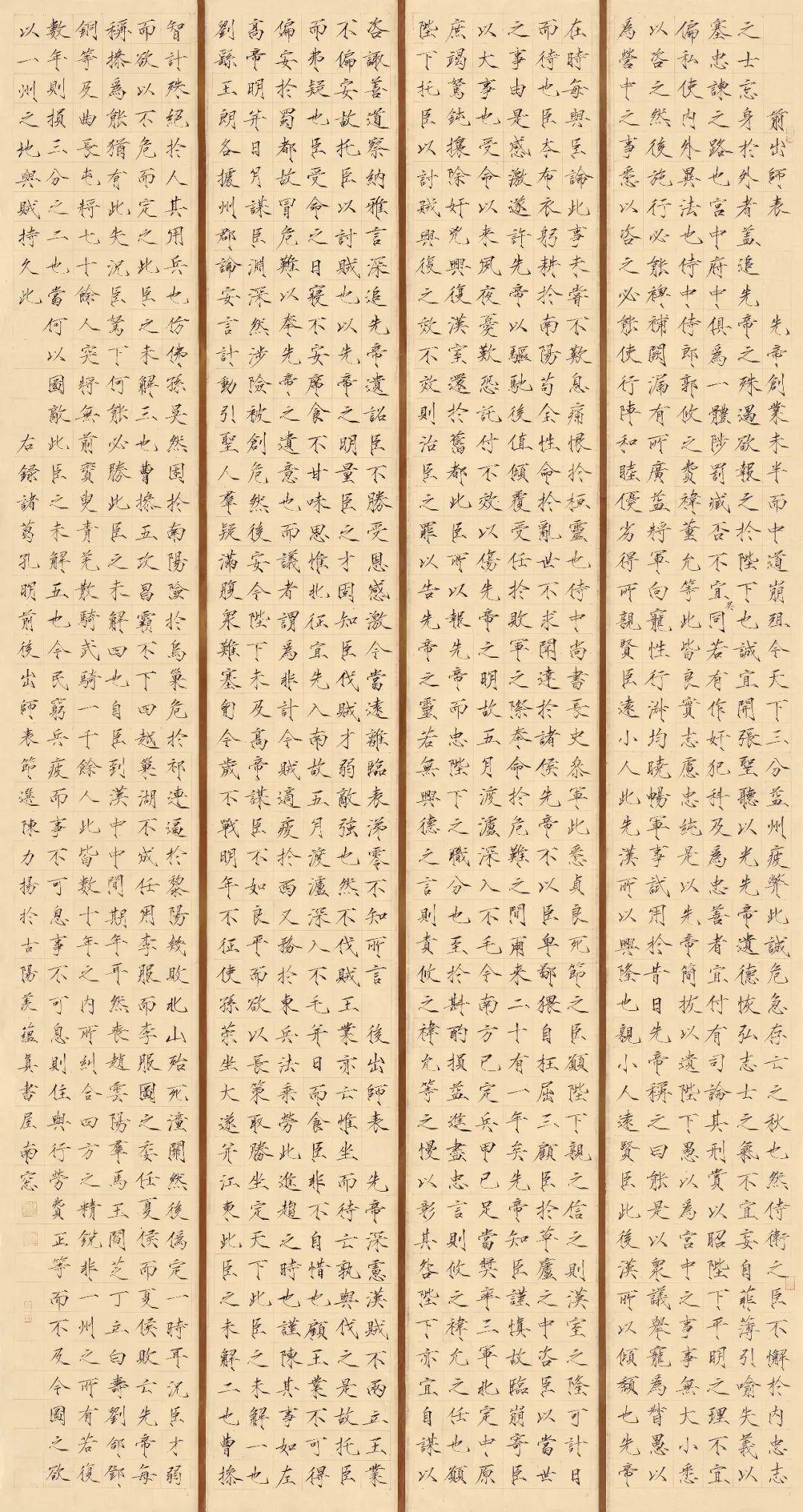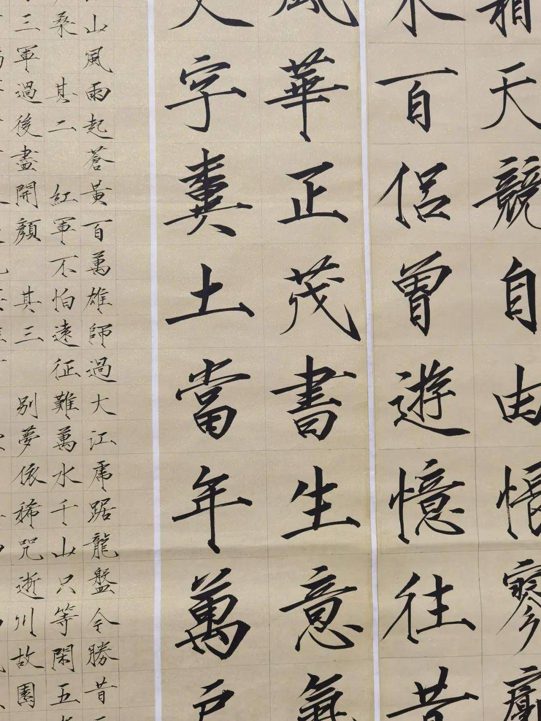 宋朝积贫积弱,却立国三百多年,比盛唐还要长寿。艺术说到底是一场教化,他输了一个形式上的帝国,却创造了一个艺术上的帝国,极简主义超越世界一千多年。现在看《侬芳诗帖》,陈力扬体验到一种挣脱生命束缚的广袤自由,看见了徽宗在艺术帝国里真正的王者之气,在一撇一捺无处躲藏、直见性命的剑气中,他将失去的大宋版图与帝王尊严一一收回了。书法大成以后才能谈创新,陈力扬在书法传承上不敢怠慢。艺术是一场苦修,没有捷径,却有法门。瘦金书的内涵更像剑仙一脉,与传统的修行门派有别,剑仙门派稀少,他们心无旁骛,擅长攻伐,剑术招招致命,没有回转余地,他们天生为攻伐而来,一心为剑,一剑可破万法。与瘦金相守了一年,力扬却在宋朝走了千年。他现在临《侬芳诗帖》,他就是三十八岁的徽宗,他书“云为衣裳花为容,”他会将李白初见杨贵妃的惊艳,与赵佶邂逅李师师的心动相较对比,找到最恰当的表达,也因此,力扬的瘦金要往雅里去一些,笔意里有种深情与温柔,女子一见,如见爱情。真的不着急,他什么都没有,手里只有一把青春,青春的本钱又是无限阔绰,因为他有青春而有自知。木心说,青春可以看作伟大的信仰来对待,而艺术是什么呢,艺术是一个梦,不过比权势的梦、财富的梦、情欲的梦,更美一些,更持久一些,艺术,是最好的那个梦。力扬做过未来的梦,瘦金一出,天下无书,少年人的狂傲不可欺,你看得见他的胸中气象,也见证他的身体力行,他将临习瘦金体的心得与宋朝美学融合,做成教材,经常在美术馆、各级学校作实验性普及,播撒艺术的种子,瘦金书的路上何愁没有知己。青春年少,兴旺发达,欲望不缺,野心不缺,倔强不缺,天真不缺,那就把这些给了艺术吧。艺术是忠贞不二的情人,瘦金书是写给青春的情书,爱艺术的少年们,你们都接收到了吗?