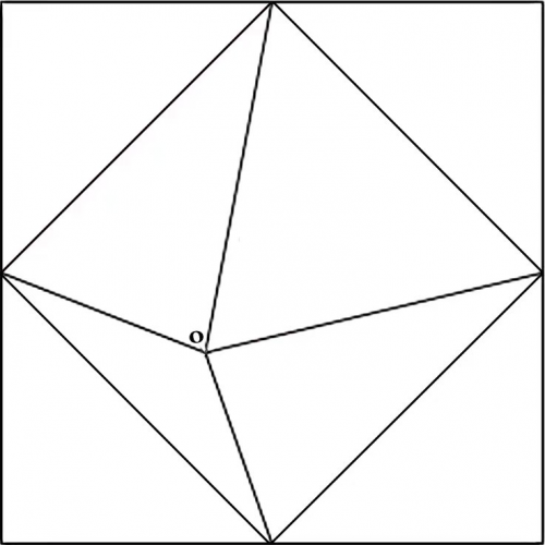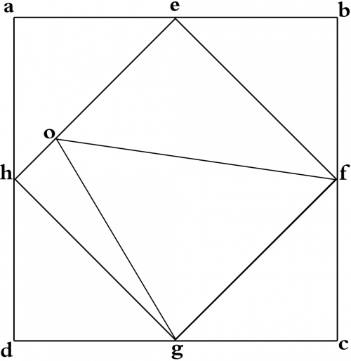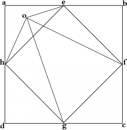 3,当正方形内的一点,在其相邻的各边中点连线组成的正方形之外时。 如图6所示: 在正方形abcd中,e、f、g、h分别为各边ab,bc,cd,ad的中点,o在正方形efgh之外。