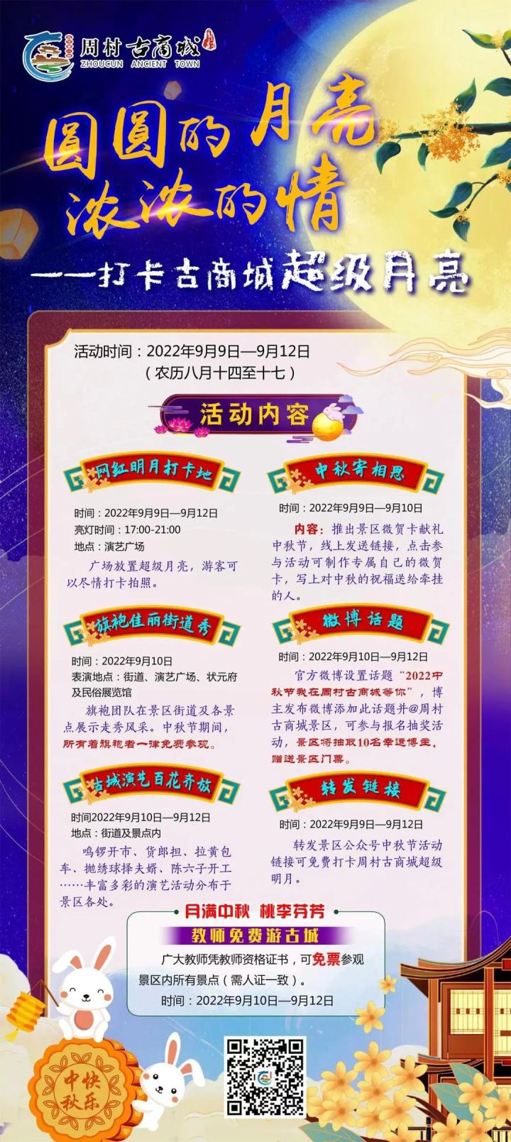 周村古商城景区 圆圆的月亮,浓浓的情—打卡古商城超级月亮 1.线下活动:网红明月打卡、旗袍佳丽街道秀、常规民俗表演。 2.线上活动:中秋寄相思、微博话题 14景点通票七五折优惠(原价120元,节日期间90元) 活动时间:2022年9月9日——9月12日 电话:0533-6436166