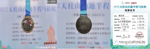 人生中第一场马拉松,而且首场还是山地马拉松安全完赛了,对我来说是个不小的挑战,在平时的运动中,从没有过难度这么大的,虽然2小时23分44秒,女子组100名,但我已经很满足了。(图片:完赛奖牌及证书)