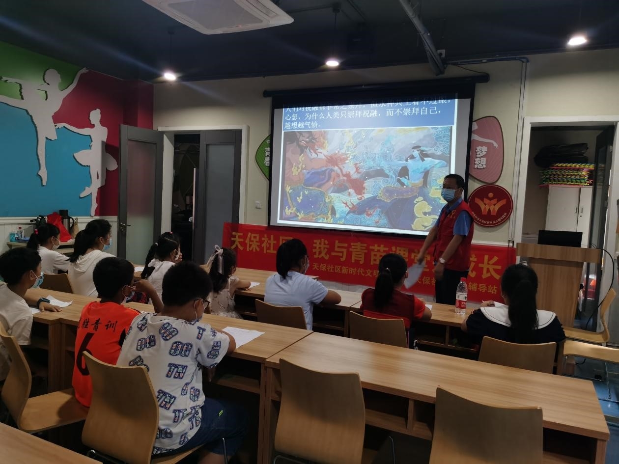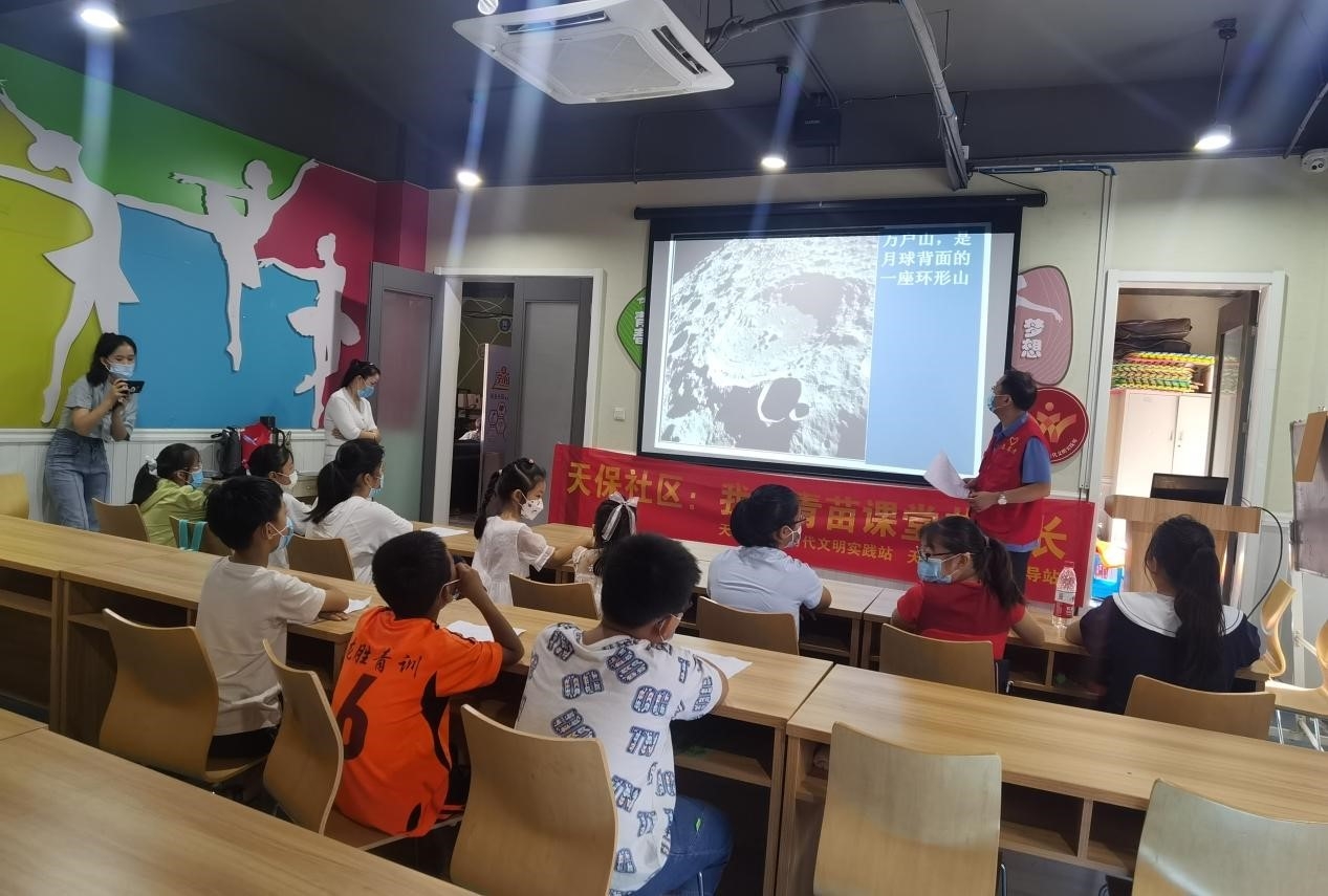 活动中,社区志愿者教师向社区青少年讲述了中国神话故事,带领孩子们领悟古代神话故事的魅力。同时,老师给孩子们播放杨利伟乘坐神舟5号飞船升空的壮举。孩子们目睹了宇航员们在太空生活的视频。孩子们充满了好奇,有的想知道杨利伟是怎么选拔出来的,有的想知道神舟飞船是怎么升空的,还有的想知道太空失重到底是怎么样的感觉……大家你一言我一语地探讨着航天的秘密。