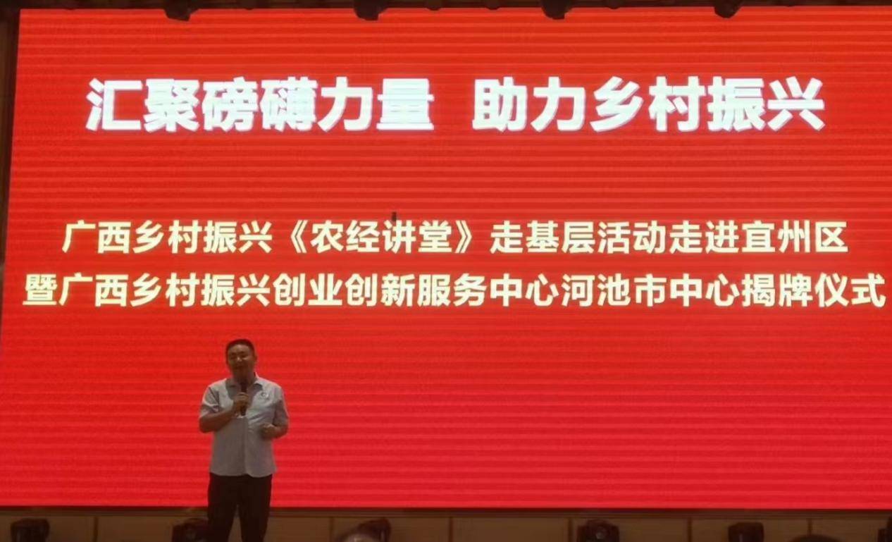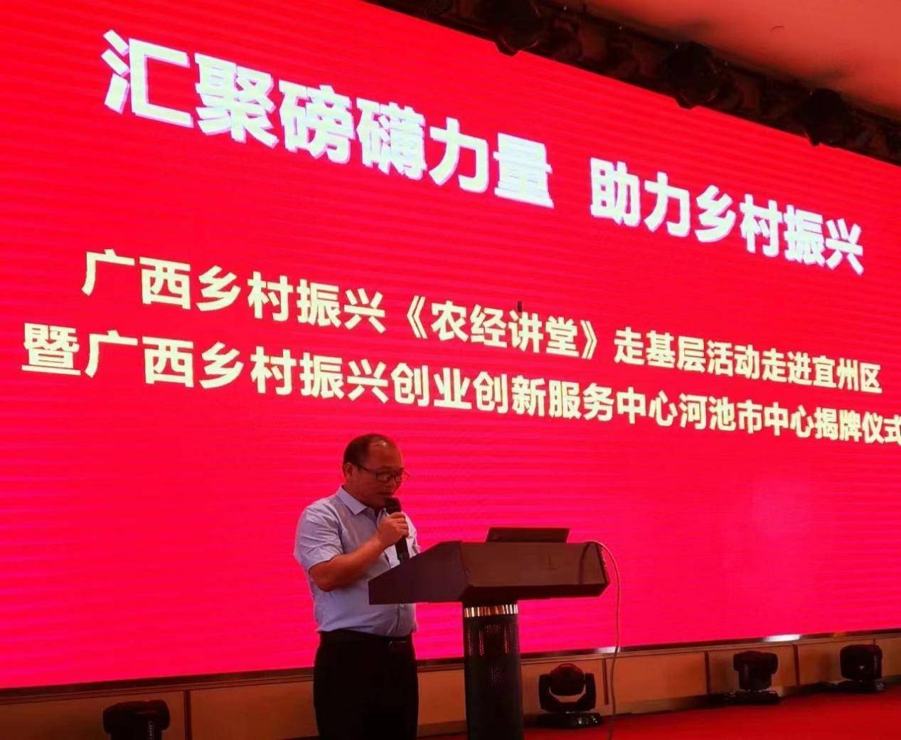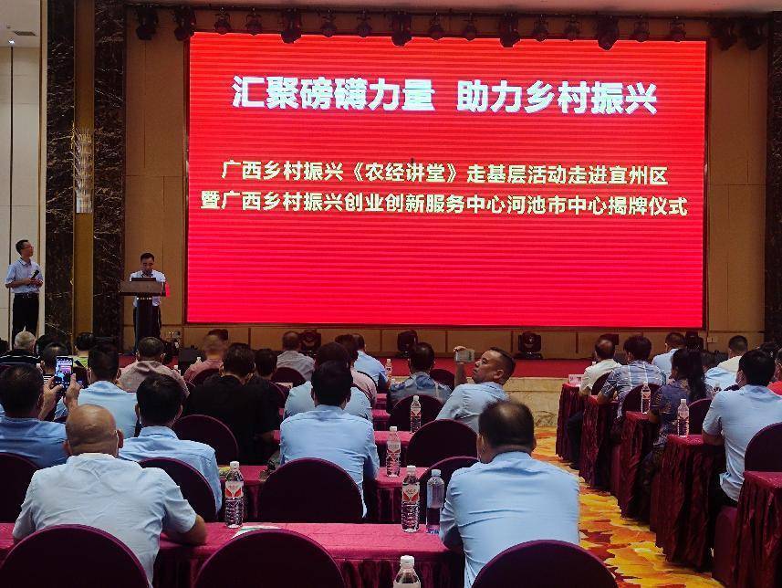 ——广西乡村振兴《农经讲堂》走基层活动走进宜州区暨广西创业创新服务中心河池市服务中心挂牌启动 金秋时节果飘香,田野欢歌丰收忙。农经讲堂走基层,传经送宝农家访。乡村振兴在路上,凝聚力量同兴邦。 9月16日广西乡村振兴《农经讲堂》走基层活动——走进宜州区暨广西乡村振兴创业创新服务中心河池市服务中心、宜州区服务中心授牌仪式在河池市宜州区隆重召开,来自河池市各县(区)服务中心、宜州区各乡镇服务站站长、种养专业合作社、家庭农场、农户代表等100多位出席了会议。