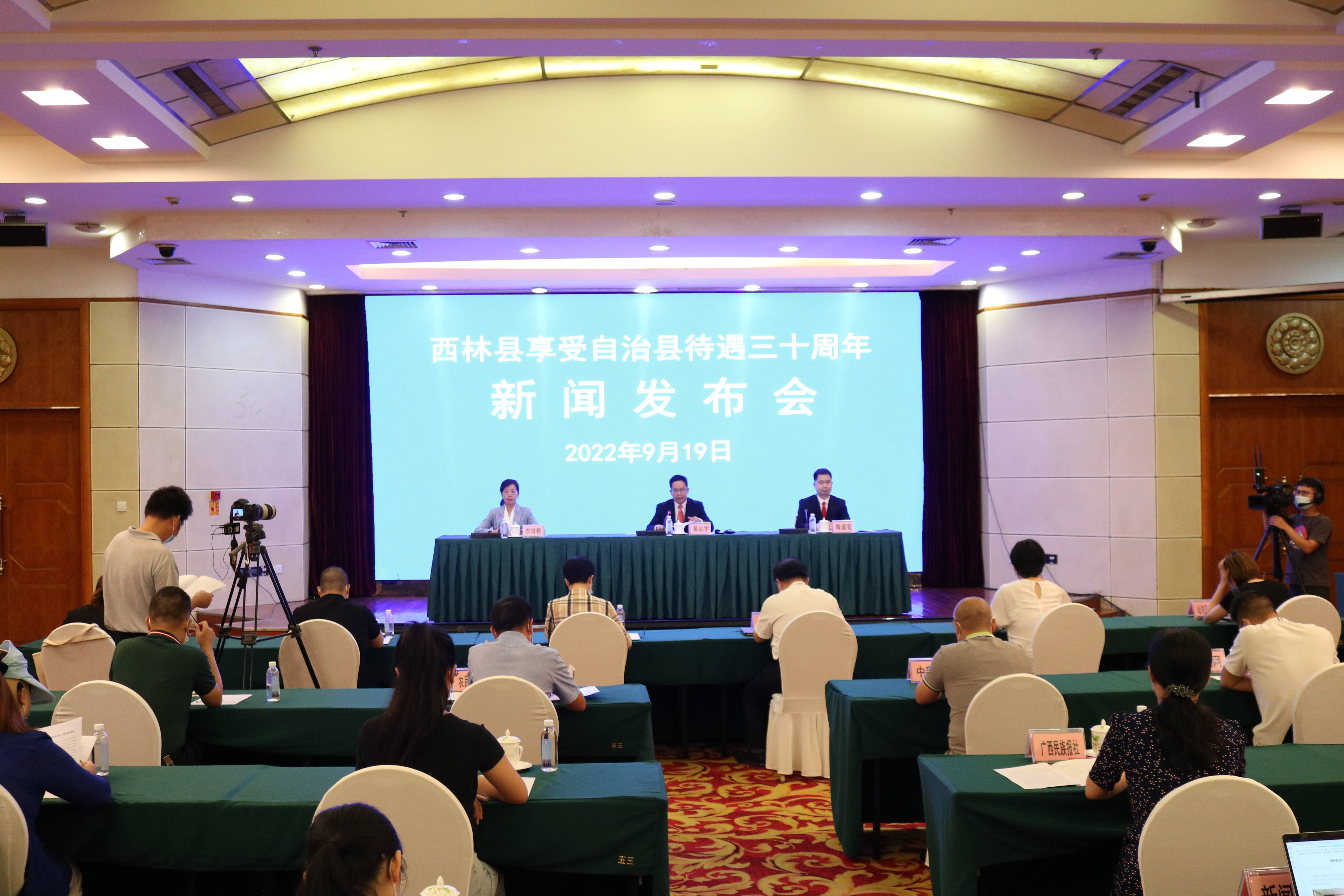 9月19日上午,西林县享受自治县待遇30周年新闻发布会在广西南宁举行。西林有关领导向媒体介绍西林县享受自治县待遇30年来,在党的民族政策光辉照耀下,西林县各族人民经过几十年接续奋斗,经济发展、脱贫攻坚、城镇建设、生态保护、社会治理、民生保障、民族团结以及党的建设取得的辉煌成就和美好前景。