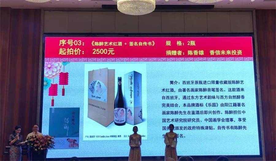 在大会举办的慈善拍卖会上,董事长陈香雄捐出了陈醉艺术红酒2瓶+陈醉签名自传书2本,最后以6500元成功拍出,所得款项全部用于商会慈善事业,为家乡公益建设奉献一份爱心。
