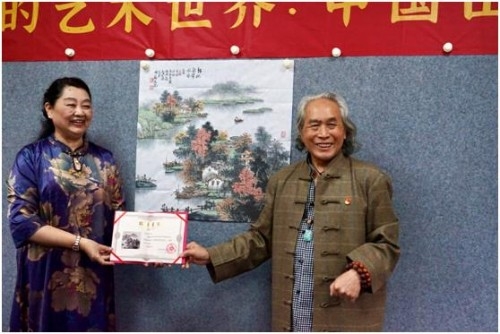 开幕式由苏州市海峡两岸书画交流协会会长、苏州寒山艺术会社会长朱文辉主持。他首先代读中国田园山水画院发来的贺电。开幕式隆重而又热烈。胥力浦先生将他新创作《新秋韵带水风香》田园山水画赠予苏州徐悲鸿艺术馆作永久收藏。 ![]() ![]()