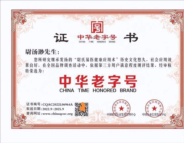 近日,笔者从相关部门获悉,有知名的传统文化学者,中国管理科学研究院品牌推进委员会客座教授、决策中国联盟智库客座教授、绍兴南易文化传播有限公司董事长、中华易学导师联盟协会副主席尉汤渺先生继承发扬的“尉氏医易健康应用术”荣获中国质量认证发展管理中心、中国企业信用发展中心联合授予的“中华老字号”殊荣。