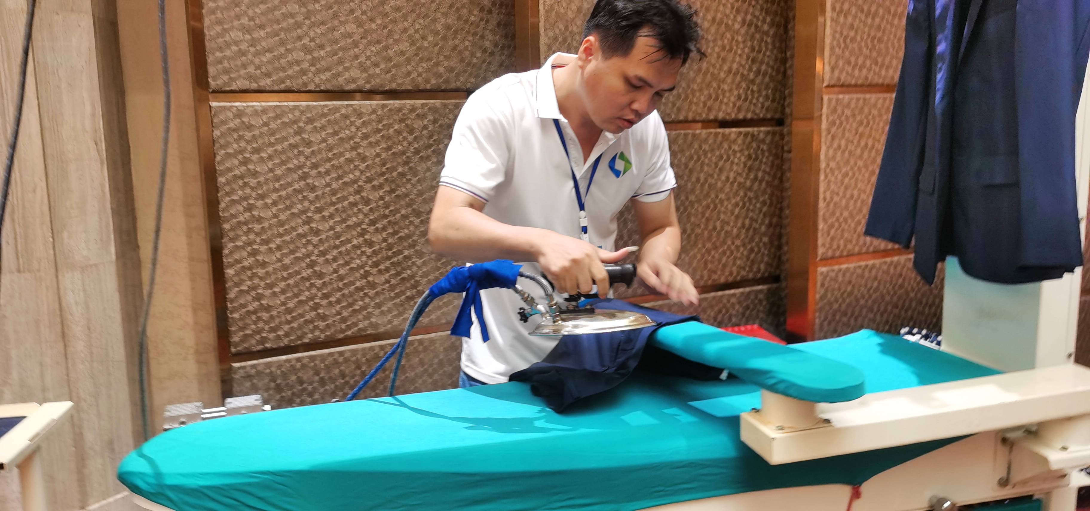 颁发裁判员聘书。 在服装熨烫项目中,选手要熨烫一套西装。手持6斤重的蒸气烫斗,速度要快、按规程来把一套西装烫好,很不易。记者采访广西洗染服务行业协会会长梁弢,他说道,服装熨烫既要体力也要讲究技术,烫衣服讲究的是烫得平、烫得“活”,活即指衣服自然的形态,比如肩部的自然隆起,就不能压得太平。只有真正热爱洗涤这一行业,耐得住寂寞,不断提升自身的技能,才能形成匠心精神。