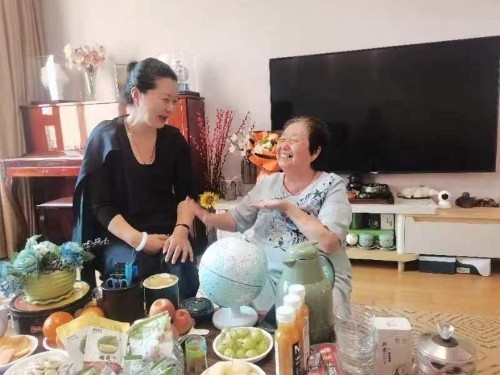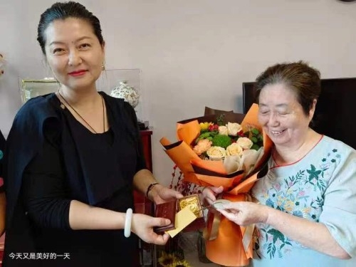 在半年多的相互微信的交流当中,陈江南得知金筑女士她在英语教学法上非常的有造诣。现在依然为很多国内外学生线上指导。于是也非常想结识这位杰出女性。今天,陈江南特意带了鲜花来拜见这位尊贵的金妈妈。看到金女士特别和蔼可亲。她们的交谈就像多年的未见的老朋友一样。当陈江南把这个宝贝送到金主任手上的时候。金主任太喜欢了,连连称好,太好了!