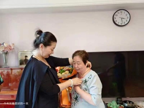 一次偶然的机会,金筑女士在网上看到她雕的玉雕扣太精美啦。于是就在网上下单,想买这块玉扣。可是因为太名贵,她又怕邮寄的过程中丢失或者是损坏。于是,她想尽办法联系到了陈江南本人。陈江南很热情地讲解了这块玉雕琢的寓意。这使得金主任更爱这个物件儿了。于是陈江南答应要亲自给她送过去。可是疫情的原因,事情一拖再拖。为了不能让老人等得太久,陈江南也不好告诉她去的准确时间去拜访她。于是就有了今天开头这一个非常感人的一幕。