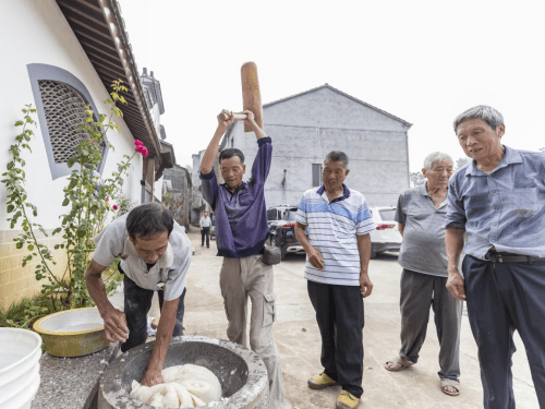 10月4日,重阳节当天,樟花村的“孝饼筒”制作在文化礼堂摆开了摊子,多位家庭主妇各展厨艺,如媳妇在家孝敬公婆般,让来樟花村共度重阳节的佳宾品尝色香味俱全的“孝饼筒”。捣麻糍可是个劳力活,这多是男子汉的行当。文化礼堂内外每处捣麻糍的场地都围起了人,谁也想轮换插上一手过把瘾。前来领取节礼的老人三五成群地赶来,说说笑笑,东看西看,并不急于去领那一袋米二包面。最开心与忙碌的要数这次活动的发起人及志愿者,他们跑前跑后,与各方面的来人打着招呼,忙着为老人与来宾作好本职工作及热情服务。