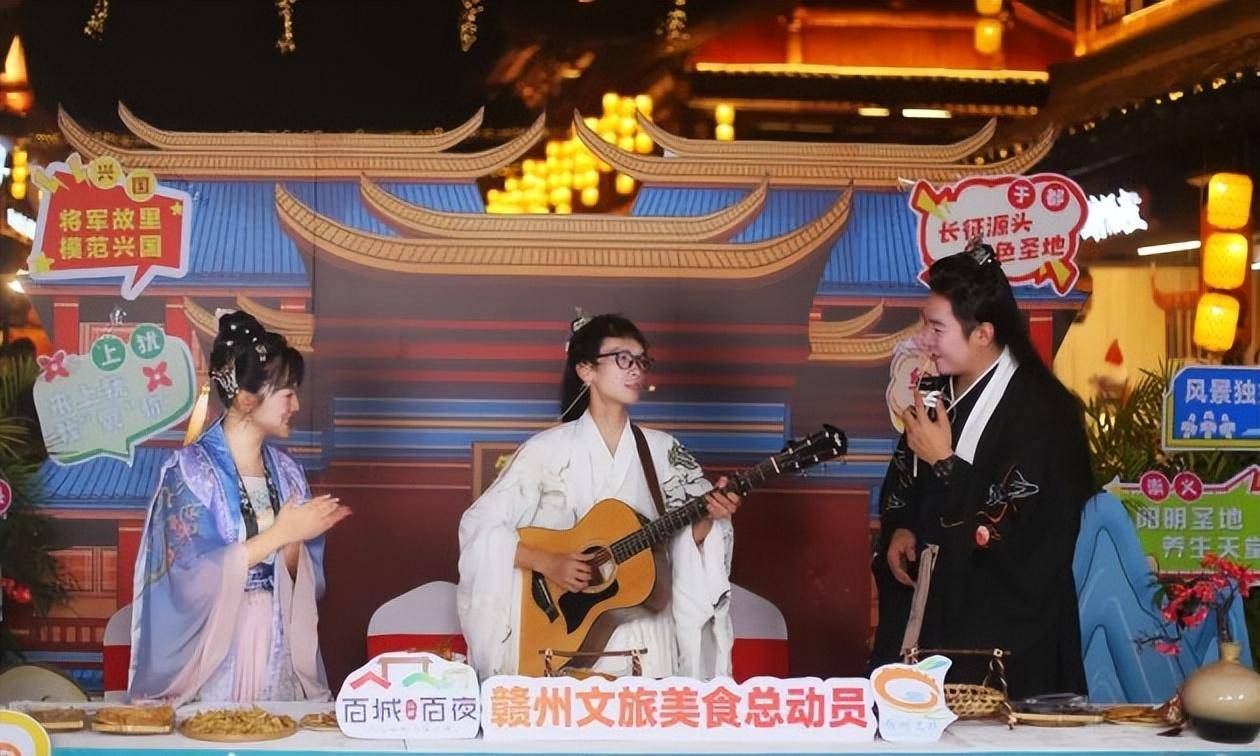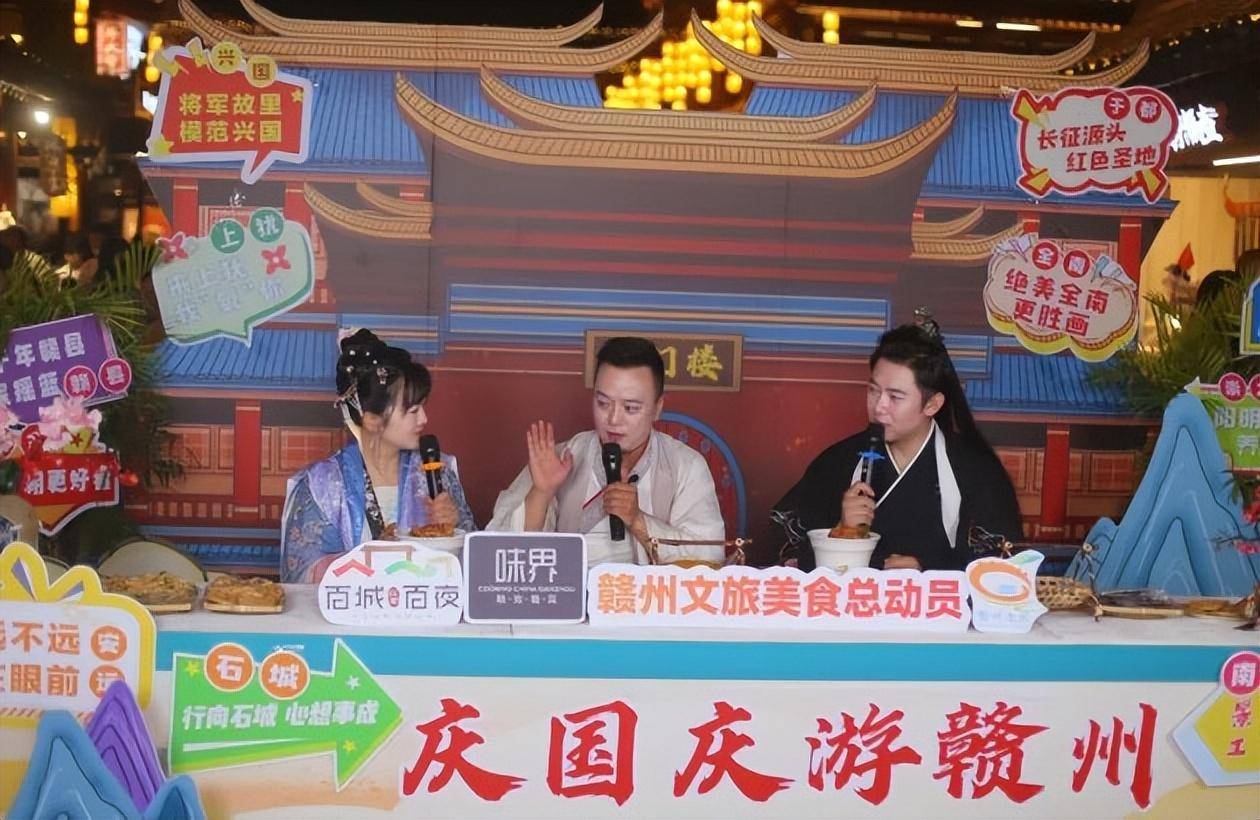 直播过程中,主持人身着精美汉服在郁孤台历史文化街区携手美食大咖钟显辉(江西省烹饪协会副会长、赣州市章贡客家菜非遗传承人、味界精致赣菜创始人)、知名音乐人钟雨龙和赣南非遗采茶戏艺术家们,给大家带来一场场精彩的内容,将现场的气氛推向了高潮。同时也向网友朋友们介绍了一系列国庆期间赣州的文旅优惠政策,获得大量网友点赞!
