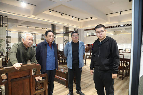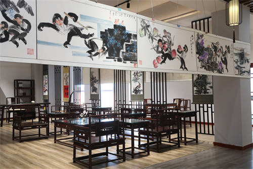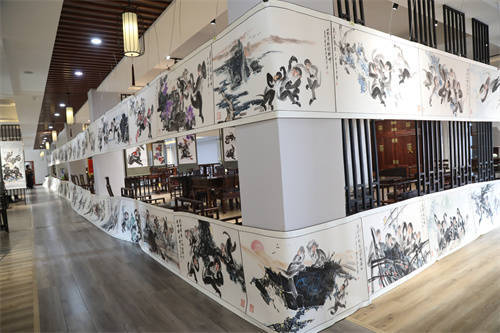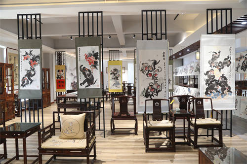 仙工坊艺术馆内用千金之材,万金之艺打造的古典家具,自有吞吐乾坤之意,海纳百川之势,一幅幅灵性十足的猴画精品与其交辉相映相得益彰。觥筹相错间,一只猴王威严端坐,桃子抱个满怀,具有王者风范;左边,一只母猴温柔侍立;右边,一只猴子高举桃子殷勤献上;近处,母猴搂着小猴爱意满满;远处,一对“情侣”相对而坐情意绵绵;树上,一只长尾猴攀着树枝荡来荡去;树下,一只环尾狐猴抱着大桃手舞足蹈......这不是动物园的猴山,而是辛华先生画的一幅百米长卷国画,画上不多不少正好100只猴子。画上有山有水真是一个猴子的乐园,喜庆热闹。每一幅画作,无不浸润着辛华先生高超的绘画技艺和独具慧心的灵感。猴的神态和灵气显露无遗,就连毛茸茸的体毛,在他独特的笔墨技法下显得异常生动,平添了无限灵性。