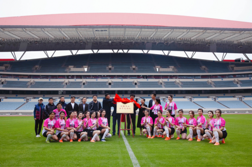 在南京奥体中心绿茵场边,江苏省体育局副局长刘彤、南京市体育局一级调研员王旭宏、著名资深媒体人陈凤玲和江苏省女子足球队总教练李红兵一起为鸿翰文化女子足球队揭牌,同时,她们与江苏省国信集团足球队的首场友谊赛也顺势开启。 |
