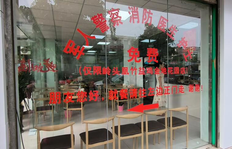 该店门口的标语格外引人瞩目,上面标注着“现役军人、警察、消防、医生、护士”免费吃鸡