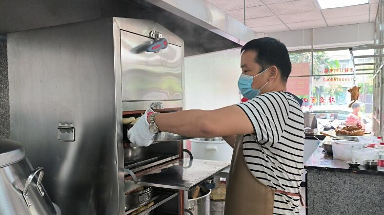 将鸡放进蒸柜中,加热到110℃隔水蒸 把蒸好的竹盐鸡拿出来