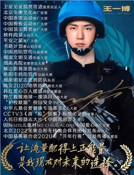 王一博是冬奥文化推广使者、冰雪运动推广大使、中国顶尖舞者推广大使、中国消防公益宣传使者、洛阳市消防宣传公益大使、湖南明星志愿消防救援队队员、中华儿慈会爱健康专项基金爱心大使等等!