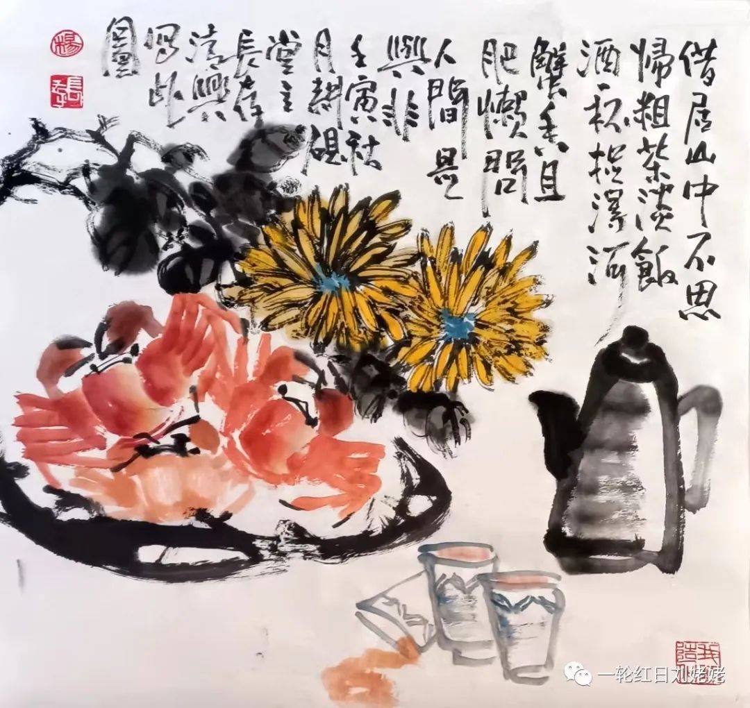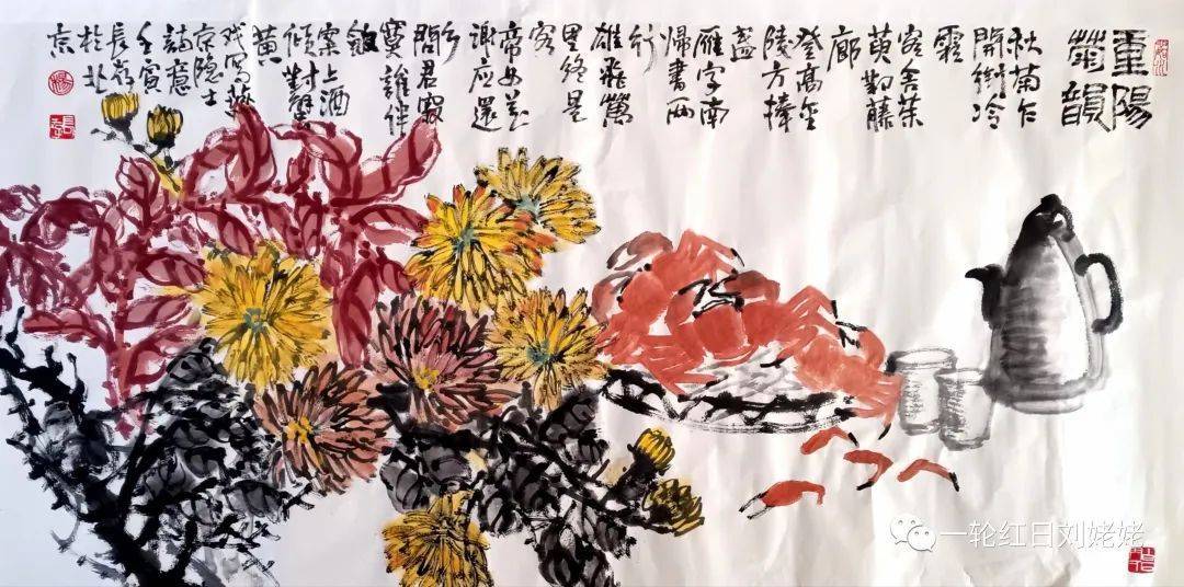 重陽菊韻 秋菊乍開衔冷霜, 客舍茱萸对藤廊。 登高金陵方捧盏, 雁字南帰书两行。 雄飞万里终是客, 帝女花谢应还乡。 问君寂寞谁伴飲, 案上倾酒对蟹黄。 一一戏写燕京隐士詩意