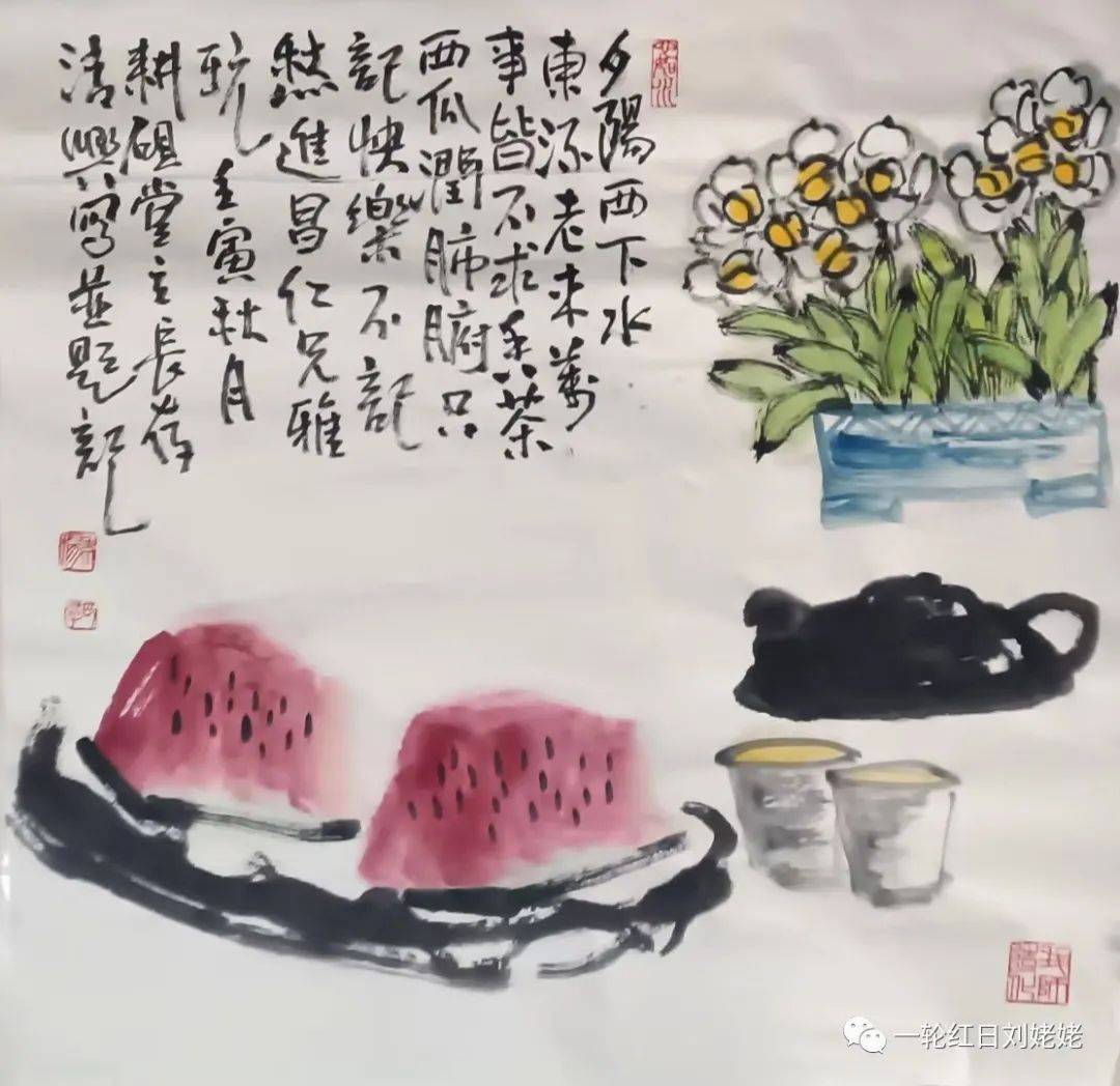 夕阳西下水东流, 老来万事皆不求。 西瓜香茶潤肺腑, 只記快乐不記愁。