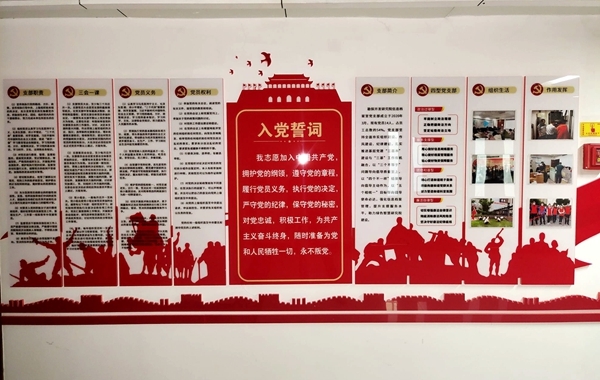 开辟党建新地标,强化宣传形象。党建文化墙以高举新时代中国特色社会主义思想伟大旗帜为指引,展示了总书记对共产党员增强“四个意识”、坚定“四个自信”、捍卫“两个确立”、做到“两个维护”等坚定理想信念方面的要求,激励大家“心中有信仰,脚下有力量”。在信息档案室党支部板块设置了入党誓词、支部职责、三会一课、党员义务和权力、支部简介、组织生活和作用发挥等几个板块,图文并茂的文化长廊构筑起一道亮丽的”红色风景线“,美化了环境的同时也进一步提升了基层党组织党建文化内涵,有力促进了党建文化知识宣传,真正做到了处处是课堂,时时受教育,让党员群众在耳濡目染中增长知识,在潜移默化中受到熏陶,让初心薪火相传,把使命勇担在肩,党建的引领作用得到充分彰显。