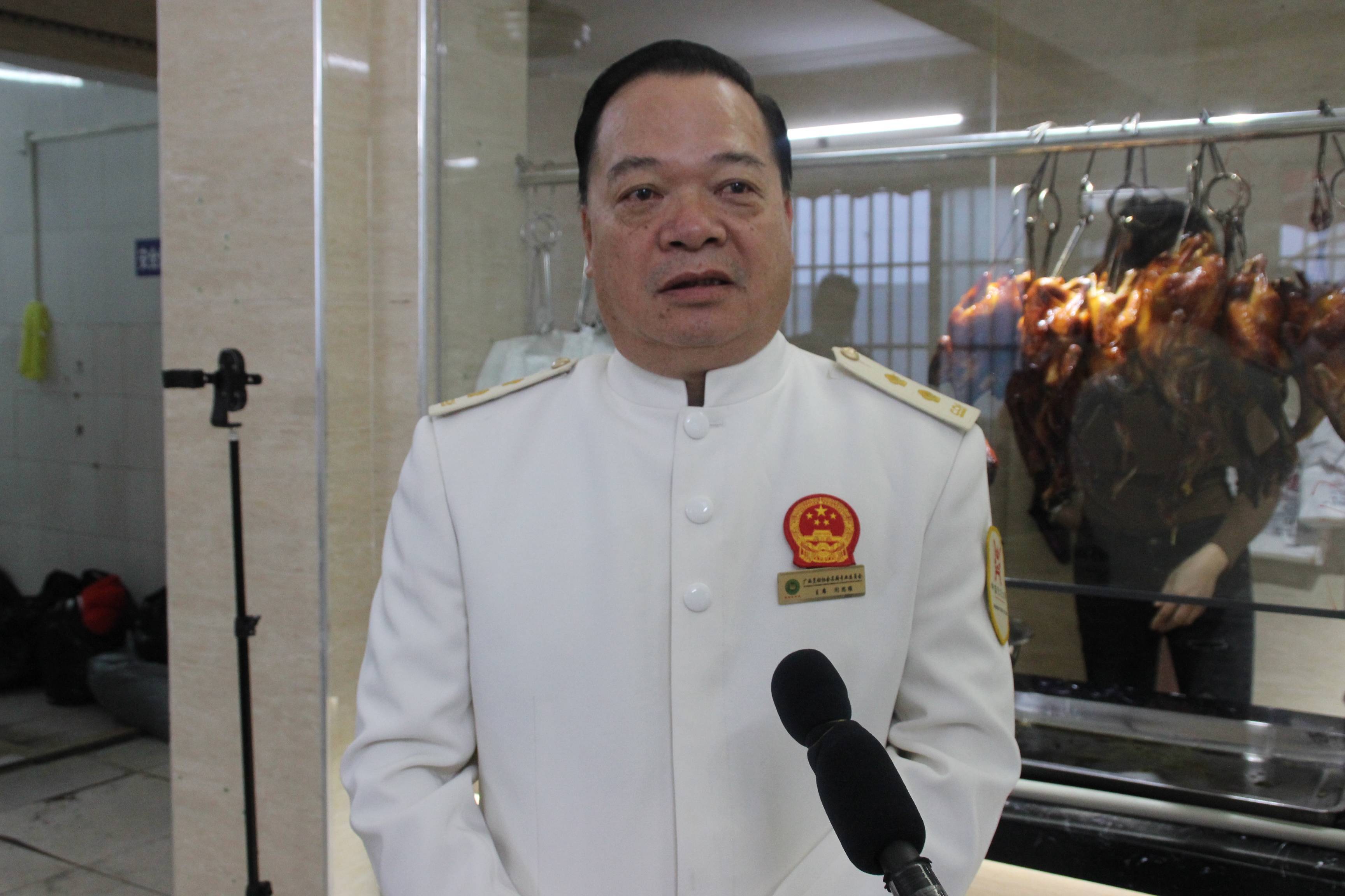 广西名厨委员会主席闭思维接受媒体采访。 据了解,岭头凰竹盐鸡创办以来,短短的两年多以来开十几家加盟店,直营店两家。刚刚开创办的一家在中尧路的一条巷子里,仅6平方米的小店一天能卖600多只竹盐鸡,很多市民从几十公里外赶来,宁愿排队几个小时也要吃上竹盐鸡。(图文/张春梅)