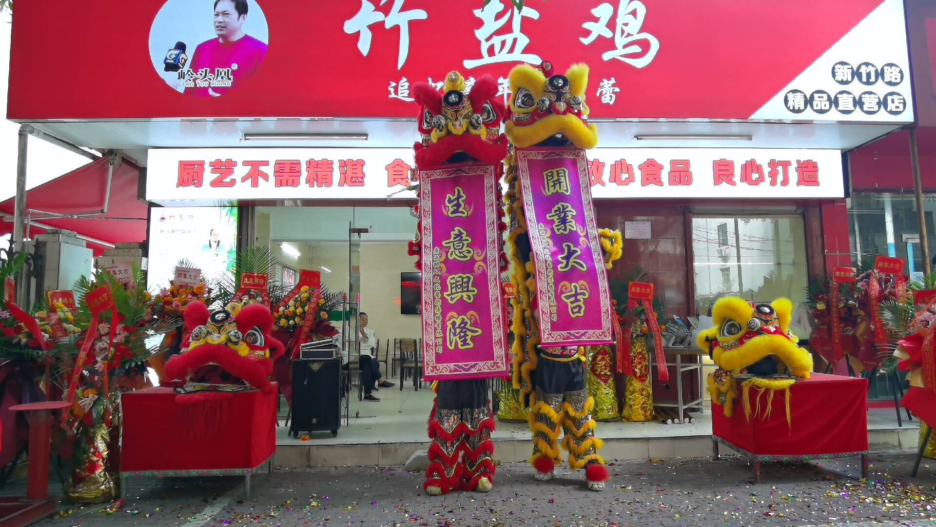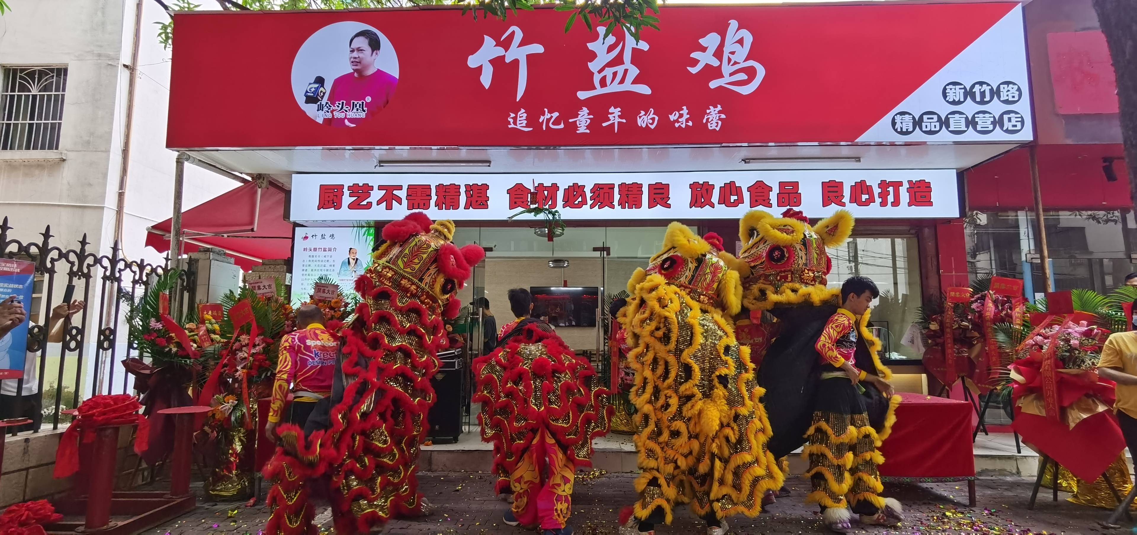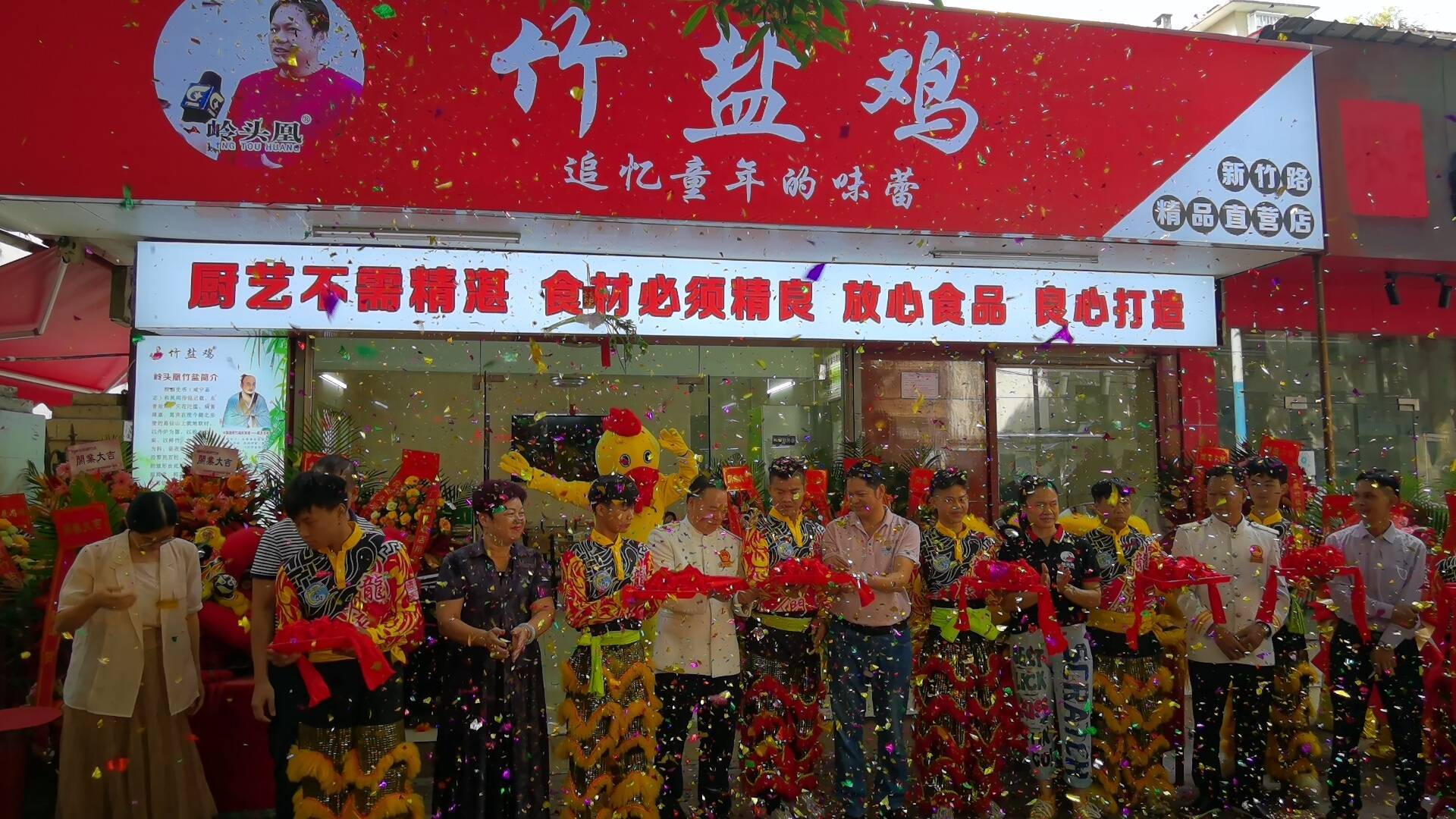 新竹店开业剪彩仪式现场。 “岭头凰”竹盐鸡新竹精品直营店在新竹路东,有5条公交车:17路、206路、220路、601路、603路公交车直达,从新竹路东进来100来米就可以看见红色的大招牌,非常醒目的店。