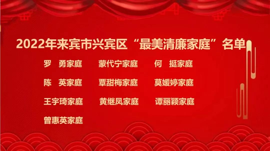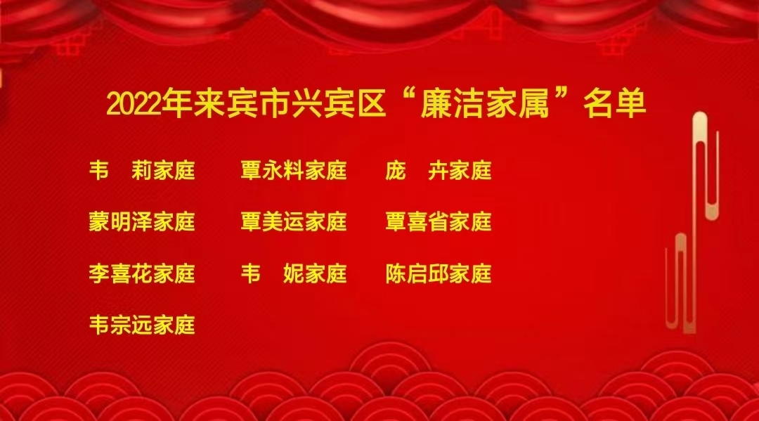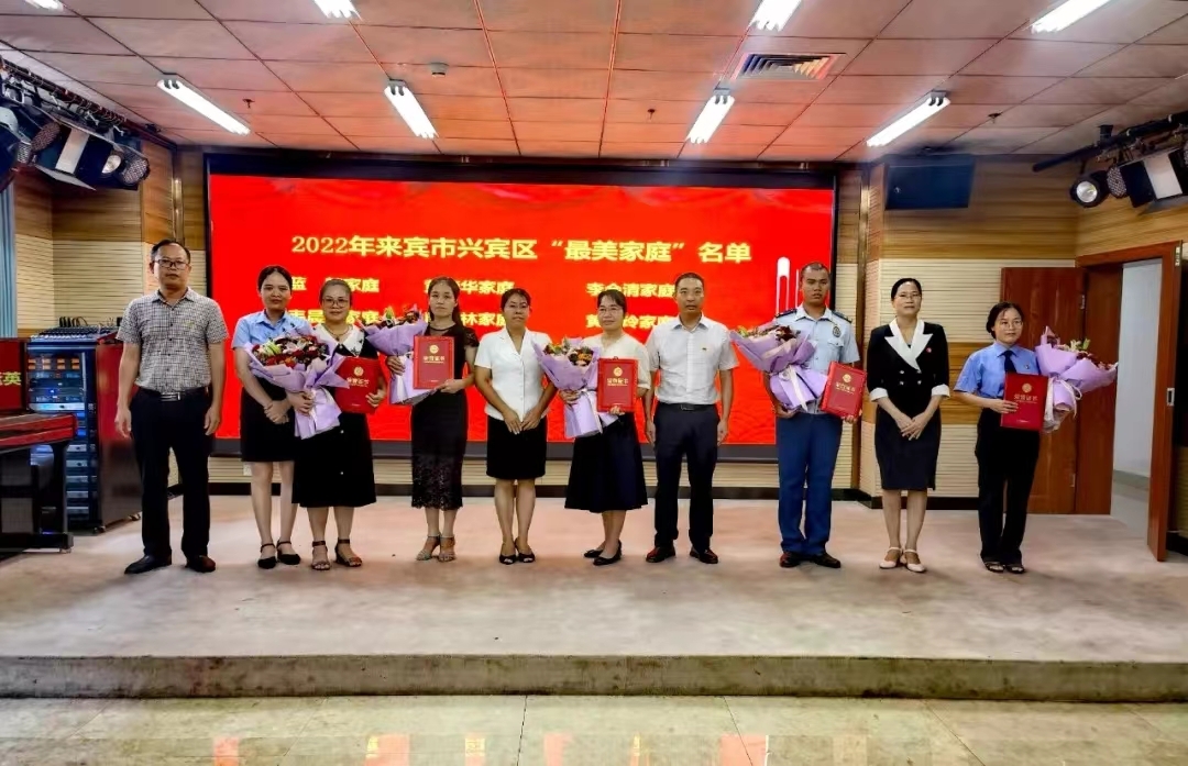 兴宾区清廉家庭建设专责小组专题工作会现场 二、强化典型树廉,传递“廉能量” 一是实施党员和领导干部清廉家庭建设示范行动,纳入全区寻找“最美家庭”活动中。以寻找“最美家庭”活动为契机,深入挖掘选树各行各业的优秀典型; 二是结合新时代文明实践道德讲堂活动开展“最美清廉家庭”、“廉洁家属”揭晓会,发挥榜样引领示范作用,鼓励大家培育传承良好家风家教; 三是常态化开展“星级文明户”“好婆媳”“红邻居”先进典型评选活动,有效发挥良好家风的浸润作用。把好家训、好家规和好家风融入文明城市、文明村镇创建中,推动化风成俗,增强廉洁文化的渗透力、引导力和影响力,进一步促使清廉家风文化在全社会蔚然成风。截至目前,兴宾区选树最美家庭39户,最美清廉家庭、廉洁家属各10户。其中,兴宾区选树的莫丽荣家庭荣获2022年全国最美家庭。廖招亮、彭宾镇家庭荣获来宾市“最美清廉家庭”。韦莉、庞卉、李喜花等3户家庭荣获来宾市“廉洁家属”。