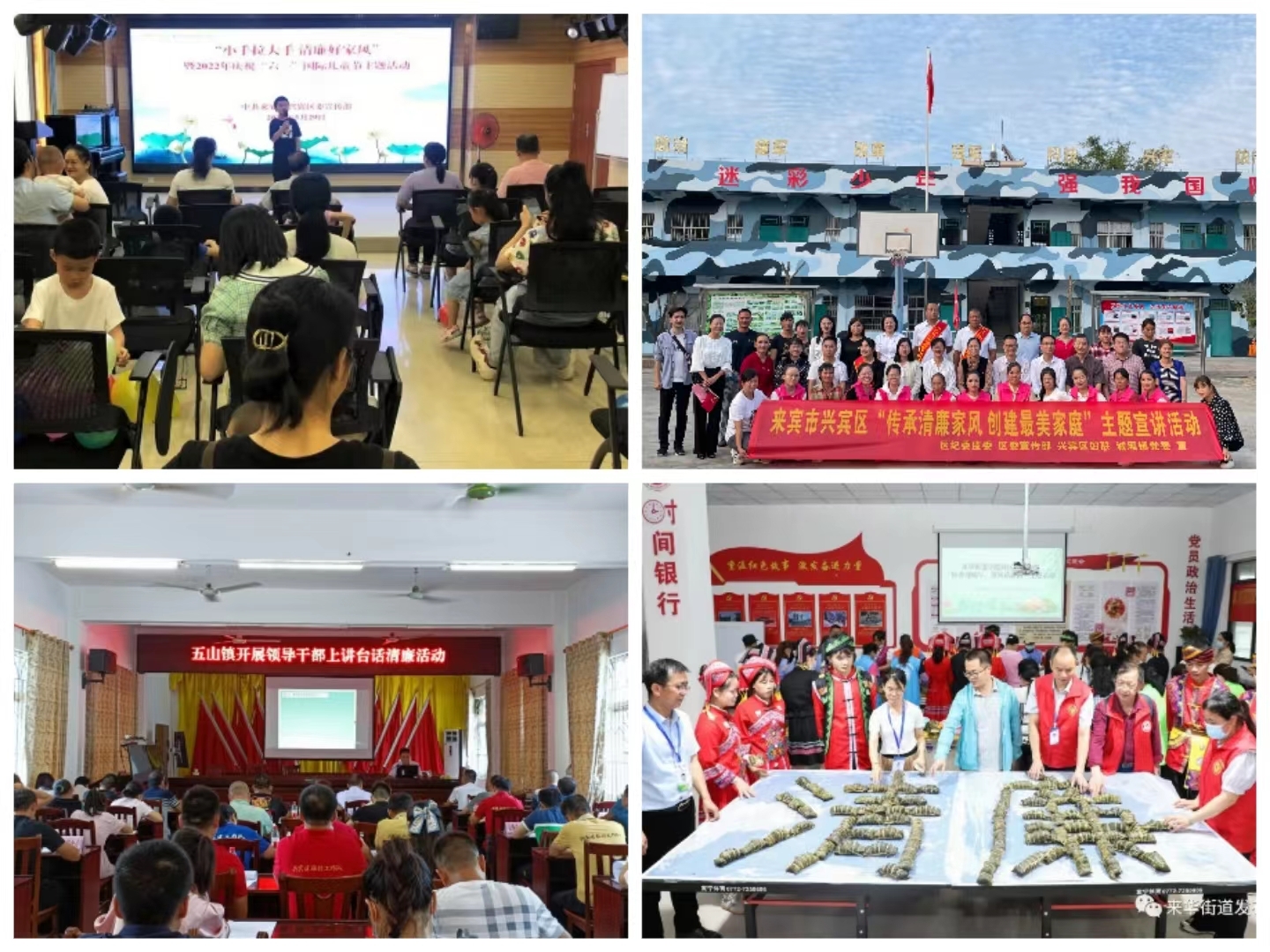 三、突出思想育廉,筑牢“廉防线” 一是紧盯“关键少数”。把家庭家教家风教育纳入各级党委(党组)理论学习中心组学习,融入党性宗旨教育、党规党纪教育全过程。目前,兴宾区各基层党组织通过“三会一课”等形式学习习近平总书记关于家庭家教家风建设的重要论述2100次,学习党员上万人(次),切实筑牢各级领导干部清廉家庭建设思想根基; 二是开展家庭助廉行动。通过“七个一”家庭助廉行动,推动清廉党风、良好家风同促进、同提升。目前,共开展警示教育120多场,清廉家风课152堂,发出廉洁倡议书8600份,进行廉政家访3800多次,书写清廉寄语5000多条,开展廉政座谈会36场,发送廉洁短信1.3万条; 三是举办系列主题活动。以传承优良家风为主题,组织开展家风家教主题宣讲、领导干部上讲台话清廉等形式多样的主题活动178场(次),推动清廉理念在家庭落地生根。