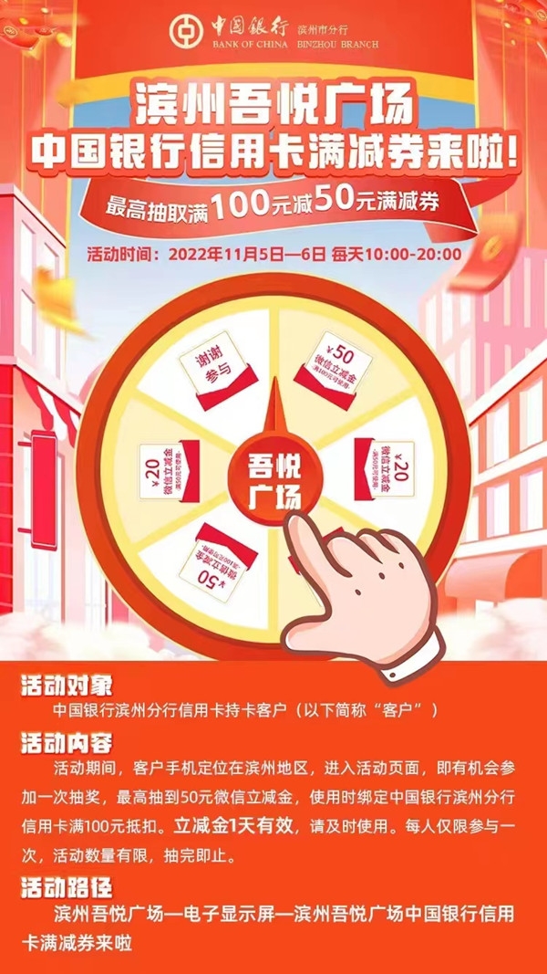 中国银行联合滨州吾悦广场发行信用卡专属消费券来啦!