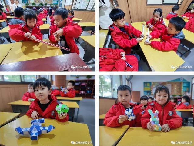 “慧读、慧解、慧讲”——激发孩子自主学习的动力,养成自主学习的习惯。让思考和表达从一种兴趣变成一种习惯。 活动2:首届“魔尺大变”数学技能学习项目 为了增强数学的趣味性,激发学生热爱数学的兴趣,创造良好的数学学习氛围。群英学校以“数学周”为契机,开展了“魔尺大变身”数学技能学习项目。通过用魔尺折造型,能培养学生的动手能力,提高孩子的抽象思维能力和空间感知能力,增强思维的灵活性。将美术与数学学科知识相融合,让孩子体会知识的融会贯通。 本次数学技能学习项目活动历时一个月,分两个阶段进行。前期准备阶段:10月1日~10月15日,各班级布置购买魔尺,创设良好的活动氛围,为开展活动做准备,数学教师根据活动方案组织学生准备参赛练习。