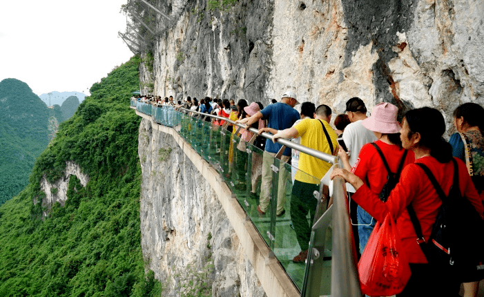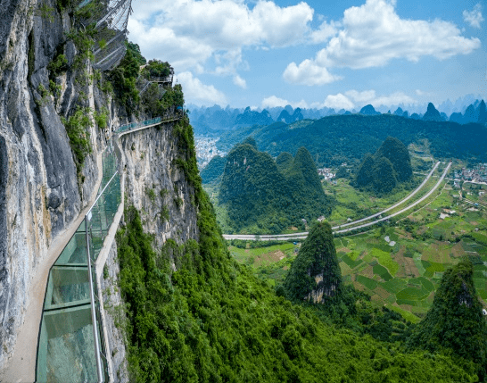 林中漫步道 游客体验项目玻璃栈道,位于项链峰岩壁东侧,沿山壁悬空而建,长138米,宽1.8米,由68块双层钢化玻璃铺成。行走其上惊险刺激,极具挑战性;眺望远方,峰林叠翠,炊烟袅袅,田园如画;蜿蜒曲折的玻璃栈道,丰富了景观视觉层次,刺激了游览者欲望,是景区最有特色的景点之一。