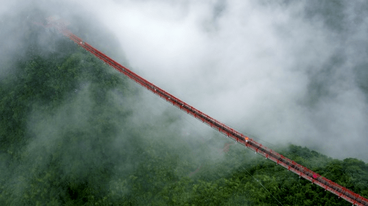 如意索桥 林中漫步道是以特立创意形态塑造的红色凌空飘带,虽为造景,宛若天然,最高点距地面32米。是一条尽情眺望万千峰林的空中走廊。漫步其间不仅可欣赏森林树冠之上非凡丰富的景观,也实现了人们亲近自然、融入自然、情景交融、从观景到陶冶性情的精神升华。