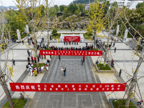 11月首个周日,浙江新昌鼓山唐诗公园南广场热闹异常,几道横幅高高悬挂,分外引人注目;开场锣鼓震天响,吸引行人驻足观赏。 原是当地旅游龙头企业新昌旅行社高调回归,重振信心,广作宣传, 联合新昌县老年人旅游协会八周年庆典,开启新旅兴旅,乐龄乐游的 新里程。
