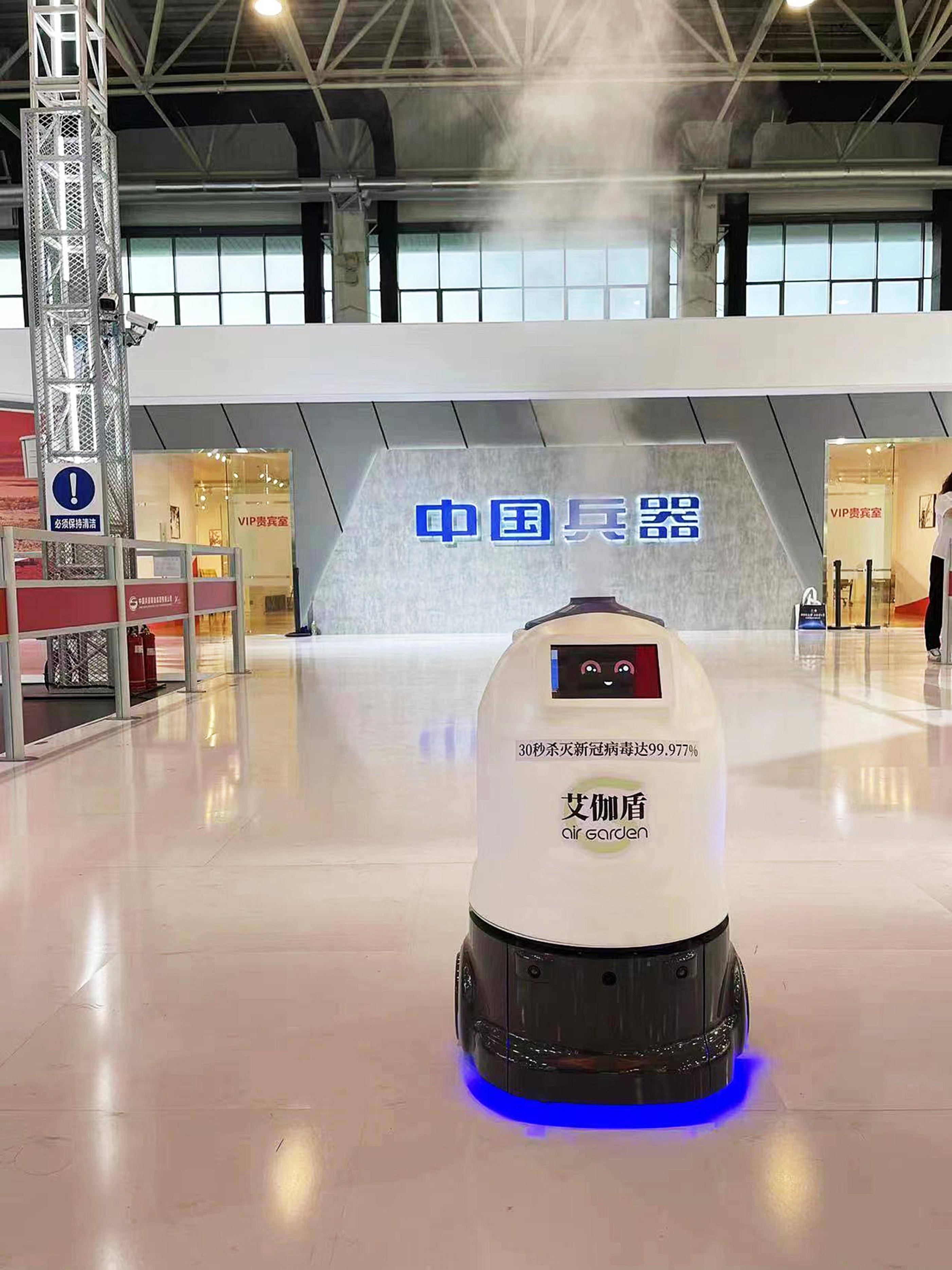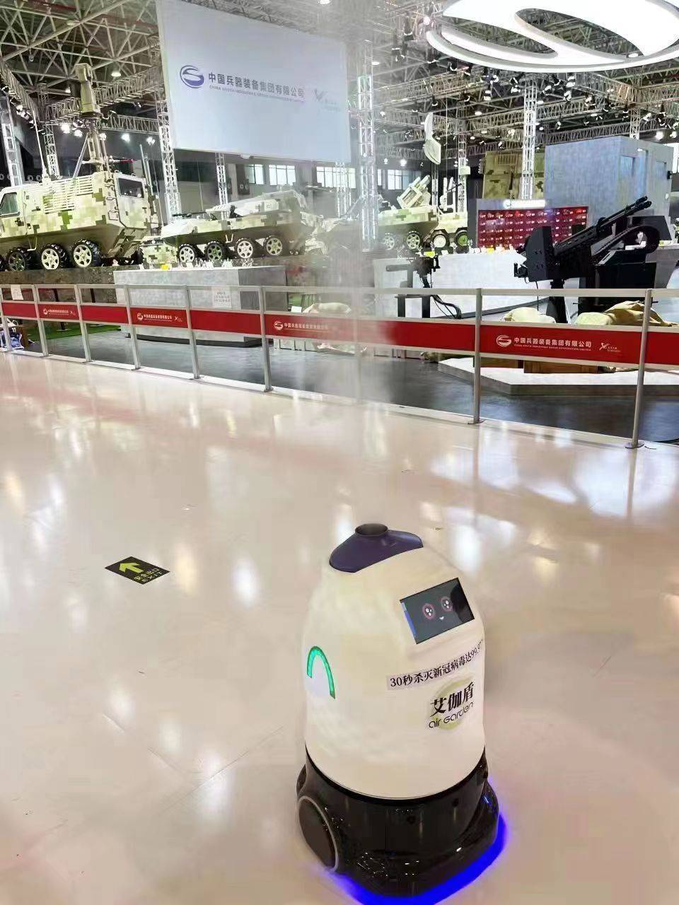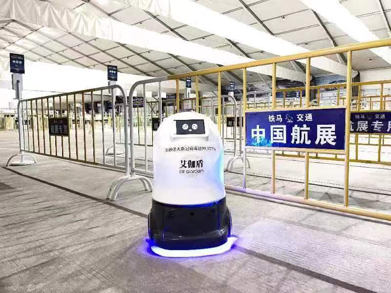 珠海产智能消毒机器人在航展现场“站岗”为助力航展馆防疫安全。 第十四届中国国际航空航天博览会展馆内迎来了一群特别的智能“消毒卫士”。