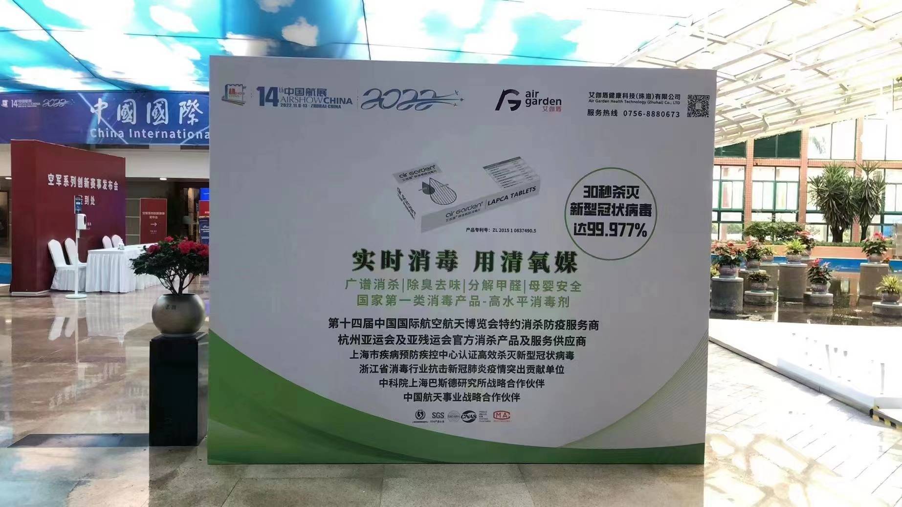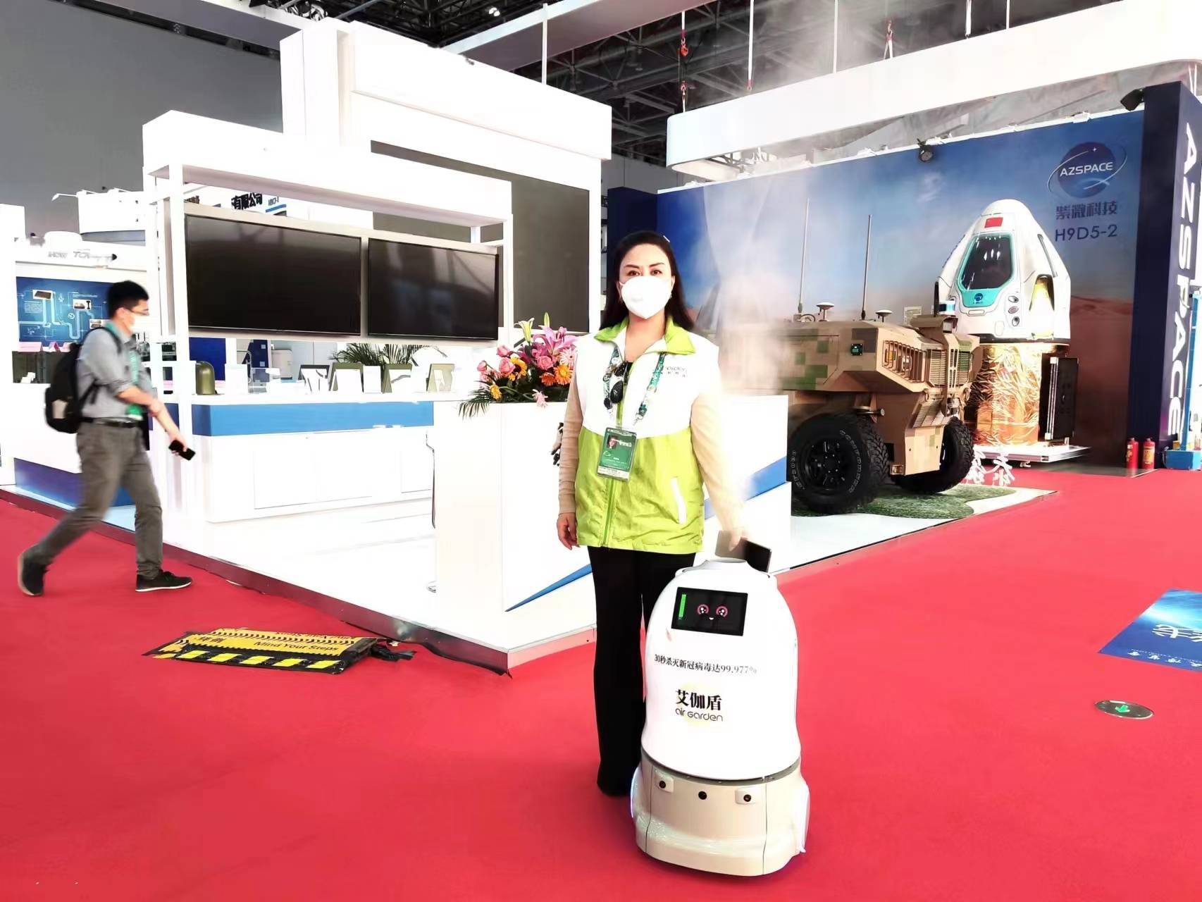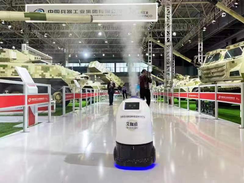 珠海高新区企业艾伽盾健康科技(珠海)有限公司(以下简称艾伽盾)凭借自身产品的科技优势,建立“智能消毒防疫服务保障”方案,定制智能消毒机器人保障中国航空航天博览会的顺利进行。“智能消毒防疫服务保障”方案着重于解决航展期间人多、聚集、人员流动量大的问题。在每一个安检出入口,场馆出入口以及新闻中心,都放置有艾伽盾独家专利的国内唯一超细雾化型移动手部消毒器,随时提供消毒服务。