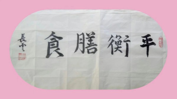 (朱长云书法:“平衡膳食”) 七、膳食平衡是健康的基础 “四季饮食四季养生!”四季养生,首先从饮食做起,“五谷为养,五果为助,五畜为益,五菜为充”,气味合而服之,以补精益气.饮食者,人之命脉也。 “五谷为养”是指黍、秫、菽、麦,稻等谷物和豆类作为养育人体之主食。我国人民的饮食习惯是以碳水化合物作为热能的主要来源,而人类的生长发育的自身修补则主要依靠蛋白质。 “五果为助”系指枣、李、杏、栗、桃等水果、坚果,有助养身和健身之功。水果宫含维生素、纤维素、糖类和有机酸等物质,还能帮助消化。故五果是平衡饮食中不可缺少的辅助食品。 “五畜为益”指牛、犬、羊、猪、鸡等禽畜肉食,对人体有补益作用,能增补五谷主食营养之不足。一个益字,说明了其补养作用,而不能成为主要成分。 “五菜为充”则指葵、韭、薤、藿、葱等蔬菜。各种蔬菜均含有多种微量元素、维生素、纤维素等营养物质,有增食欲、充饥腹、助消化、补营养、防便秘、降血脂、降血糖、防肠癌等作用,故对人体的健康十分有益。