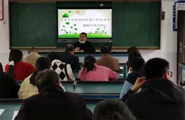2022年11月23日,新邵县小塘镇言栗中学在物理实验室召开全体教师防性侵工作推进会,孙湘校长主持会议。 首先,孙校长宣读了各级防性侵主题会议精神,罗列了近年来频发的各类性侵案件,指出了性侵案件的隐蔽性和危害性,特别强调了学校防性侵工作的重要性和必要性。 然后,孙校长对当前教师防性侵工作作了周密部署,他要求班主任牵头,组织科任老师开展好“六个一”教育活动(观看一次预防性侵教育专题片、发一封致家长的信、上一节预防性侵害教育课、开一次主题班会、开一次家长会、进行一次家访);要求班主任务必做好周末、节假日放假前常态化5分钟安全教育以及每周向学生家长发送家庭教育、预防性侵教育内容的安全提示信息等工作;要求校务班子成员务必“眼观六路、耳听八方”,切实履行侵害未成年人案件强制报告制度,坚决把一切潜在的性侵隐患消除在萌芽状态。 接着,学校政教主任宣读了《2022年下学期言栗中学教师防性侵承诺书》,要求全体教师签名承诺,并做了相关解释工作。 近年来,言栗中学高度重视防性侵工作,多次召开了全体教师防性侵专题会议,也要求班主任召开防性侵主题班会成常态化,学生的防性侵意识进一步增强,自我保护能力进一步提高。(通讯员:孙湘 尧淑国)