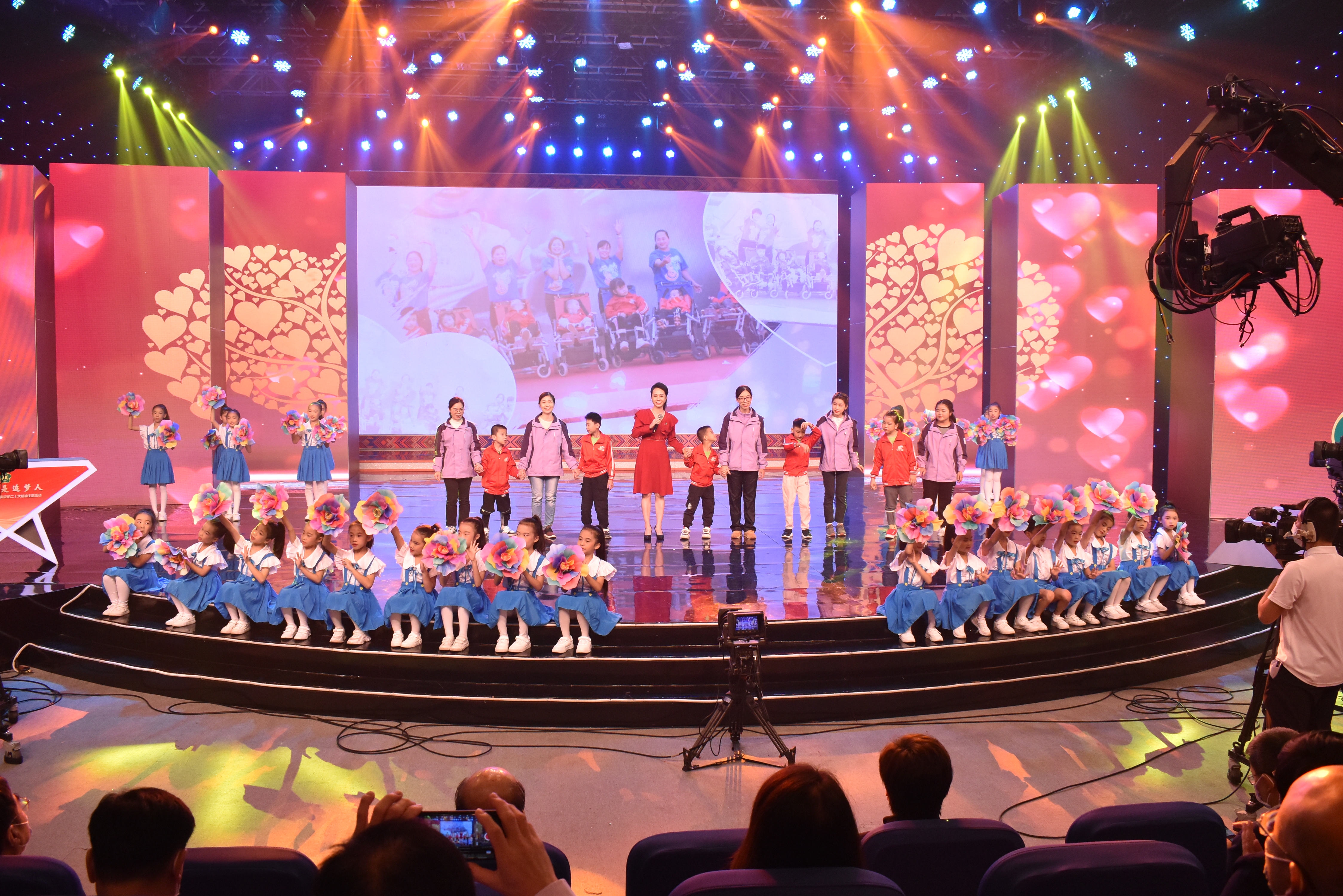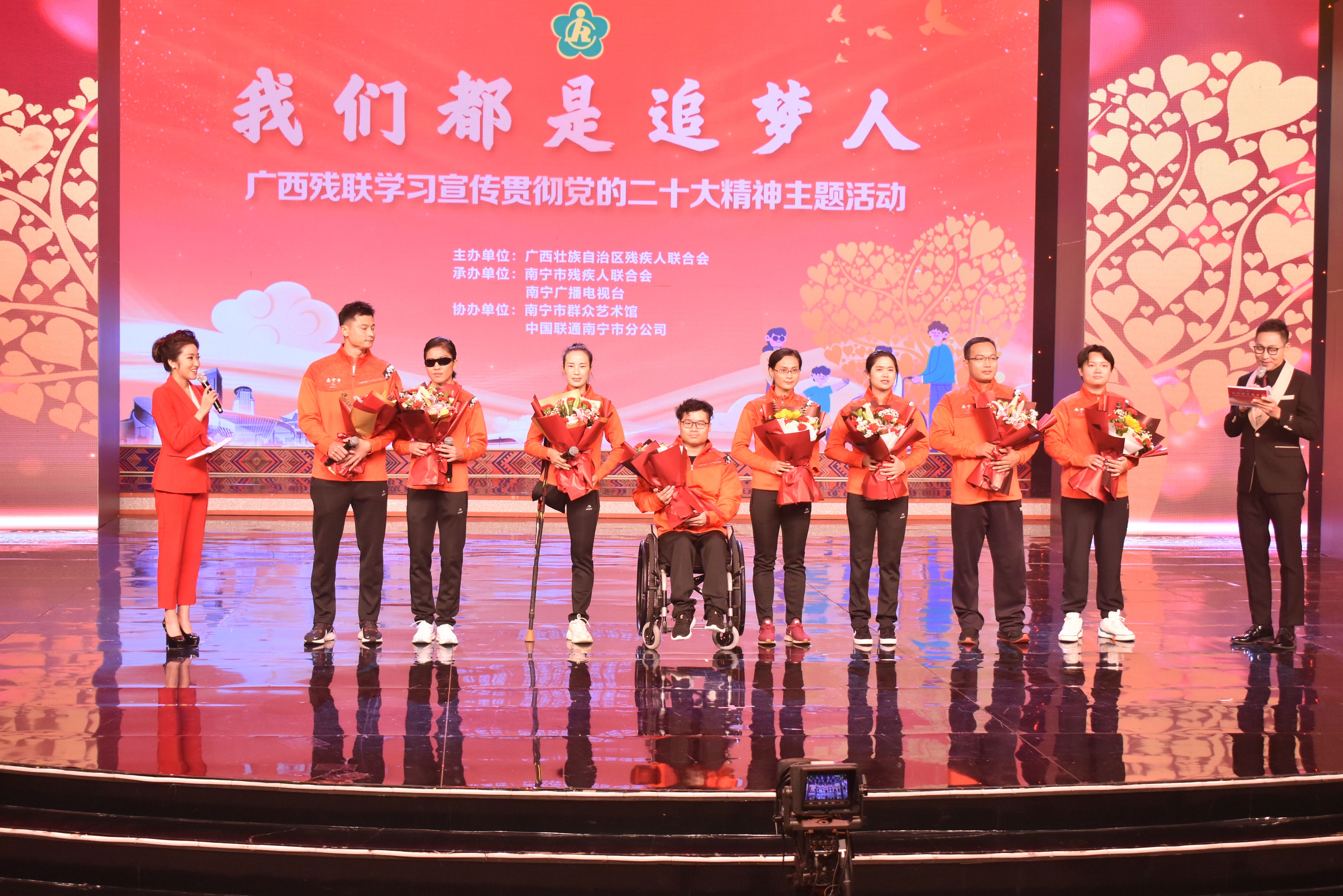 图为出席活动领导与全体嘉宾、演职人员合影 主题活动共分为“我们都是追梦人”“榜样的力量”“爱与未来”“互助 共建 共享”“感党恩、永远跟党走”五个篇章,现场播放了《广西残疾人事业发展综述》《广西残疾人体育健儿群像》《广西残疾人致富带头人》《广西特殊教育与残疾儿童康复》《助残掠影》《广西残疾人就业保障工作综述》等专题片。活动展现了在自治区党委、自治区人民政府的坚强领导下,我区残疾人事业在民生保障、教育就业、康复托养、文化体育等各领域取得的发展成就,体现了社会各界扶残助残的良好风尚,展现了残疾人自强不息的精神风貌,营造了全社会关心支持残疾人事业的良好氛围。