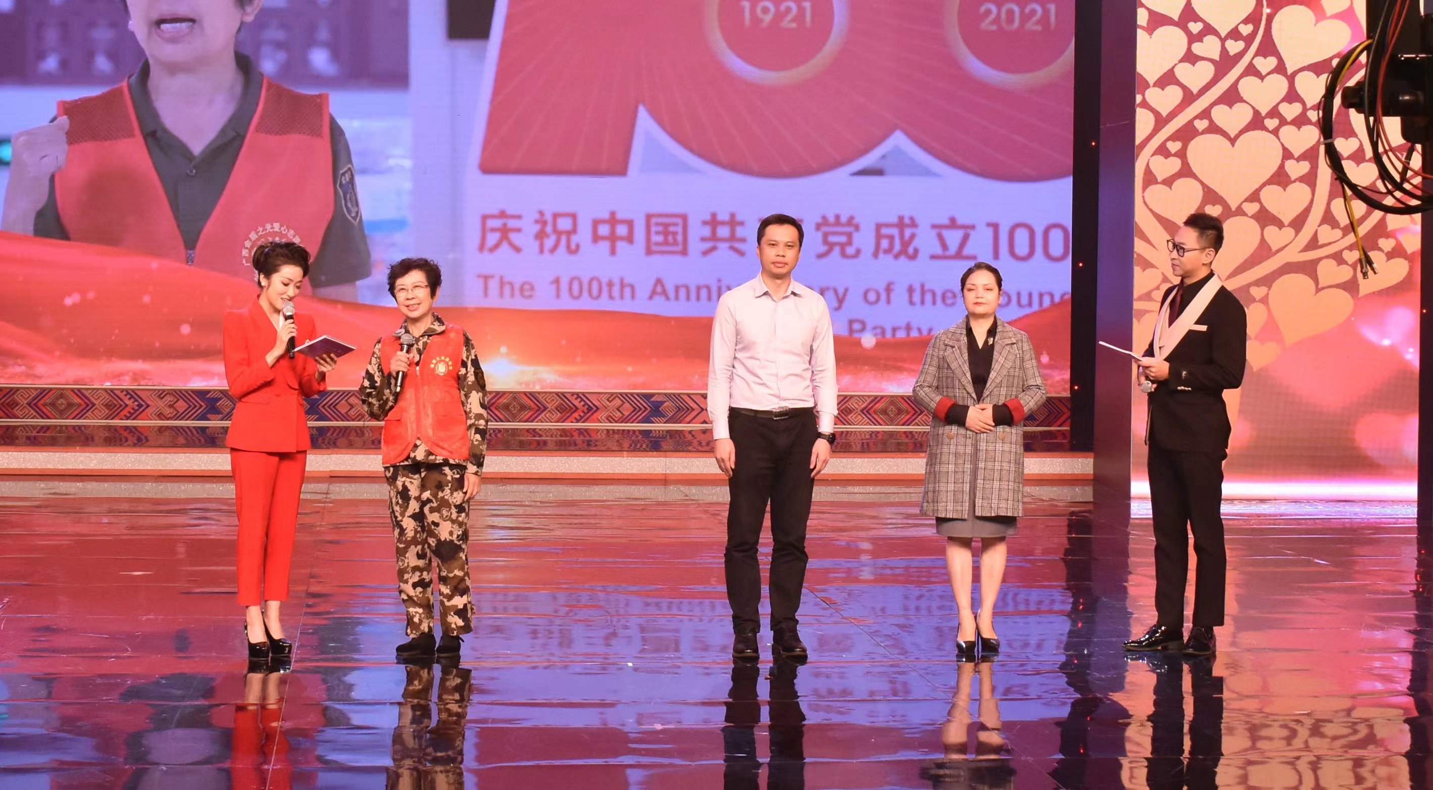 图为全国脱贫攻坚奖先进个人黄立温、韦忠勇接受访谈 活动邀请了刘翠青等8名优秀残疾人运动员(领跑员),全国脱贫攻坚先进个人黄立温、韦忠勇,特教老师代表刘芹,全国学雷锋最美志愿者王家玲,爱心企业代表——中国联通南宁公司副总经理李波、广西双英集团股份有限公司人力行政经理谢凯霞等嘉宾分享了自强不息的奋斗故事和大爱无疆的爱心助残故事,表达了感党恩跟党走的坚定决心。