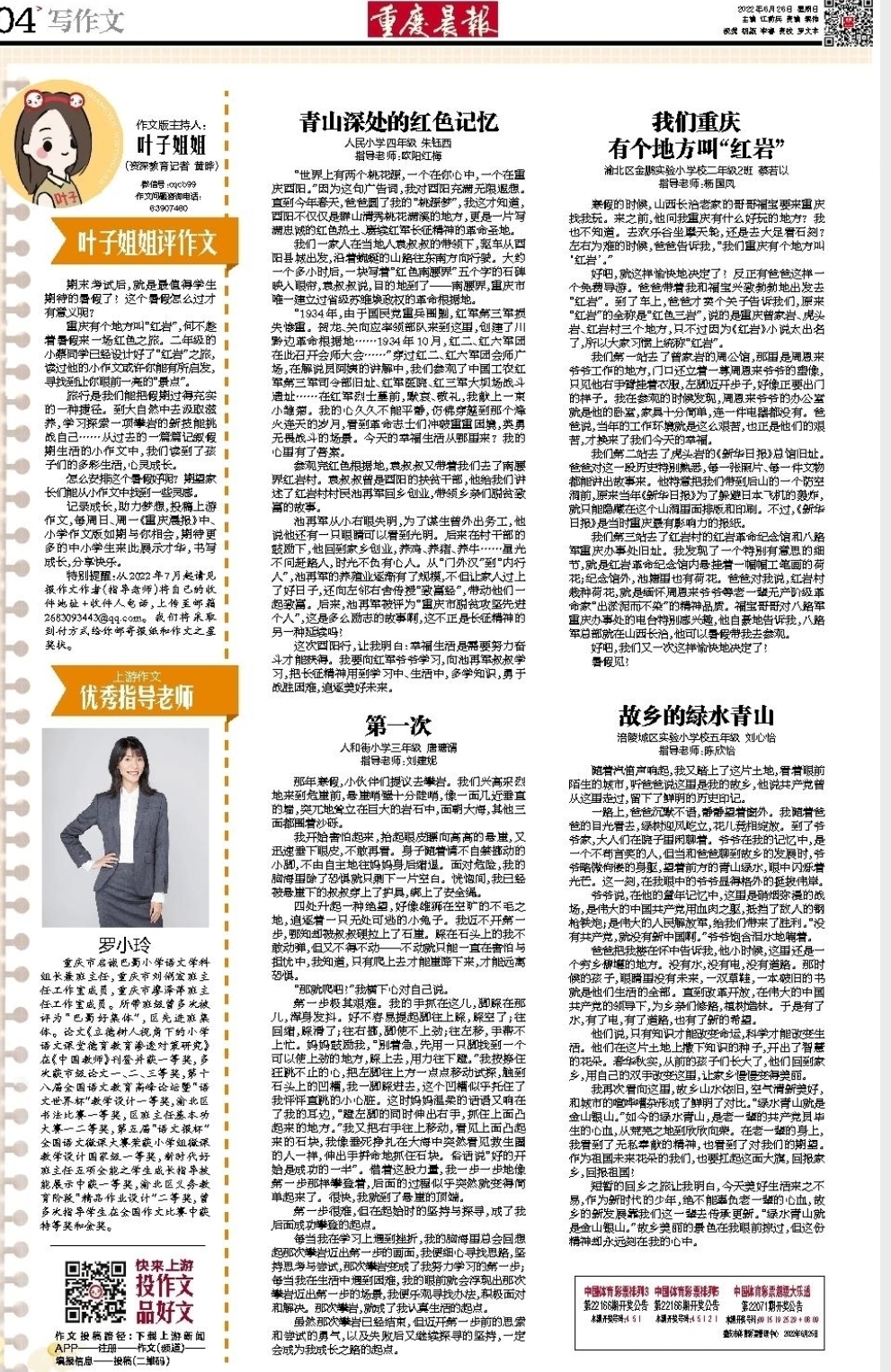 ![]() ![]() 【罗小玲老师介绍】 重庆市启诚巴蜀小学语文学科组长兼班主任,重庆市刘俐宏班主任工作室成员,重庆市廖泽萍班主任工作室成员。所带班级曾多次被评为“巴蜀好集体”,区先进班集体。论文《立德树人视角下的小学语文课堂德育教育渗透对策研究》在《中国教师》刊登并获一等奖,多次获市级论文一,二,三等奖,第十八届全国语文教育高峰论坛暨“语文世界杯”教学设计一等奖,渝北区书法比赛一等奖,区班主任基本功大赛一二等奖,第五届“语文报杯”全国语文微课大赛荣获小学组微课教学设计国家级一等奖,新时代好班主任五项全能之学生成长指导技能展示中获一等奖,渝北区义务教育阶段“精品作业设计”二等奖,曾多次指导学生在全国作文比赛中获特等奖和金奖。 |