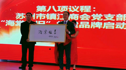 会上还举办了镇江商会党支部“海棠依旧”党建品牌启动仪式,中国传统文化交流与促进会理事蔡琨教授向商会赠送周秉宜亲笔题写的《海棠依旧》。苏州市浙江商会会长李仙林致辞,希望与兄弟商会继续同频共振,共同发展,一起携手为企业家搭建更好的平台。