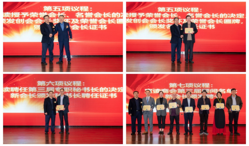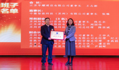 会议审议通过了上一届理事会工作报告,以及《第三届理事会、监事会选举办法》、《第三届理事会、监事会候选人建议名单》、《苏州市镇江商会章程》和《苏州市镇江商会会费缴纳及使用管理办法》有关条款的修改说明,并选举产生了新一届领导班子。 江苏华耀建设有限公司董事长王志新当选第三届理事会会长,中傲智能科技(苏州)有限公司董事长当选为监事长。会上,为新当选的领导班子成员进行了现场授牌。新当选会长为新聘秘书长和顾问代表颁发了聘书。同时,还宣读了荣誉会长、名誉会长决定,并颁发奖杯及牌匾。