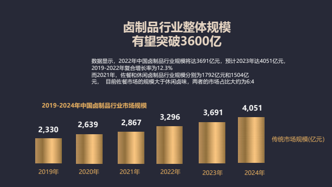 近日,厦门海货郎食品有限公司获得了星凌资本和柳进创投500万的天使轮投资,公司估值5000万!此次融资的资金主要用于品牌渠道及供应链的建立完善、新品研发以及运营。 卤制品行业 数据显示,2022年中国卤制品行业规模将达3691亿元,预计2023年达4051亿元,2019-2022年复合增长率为12.3%。而2021年,佐餐和休闲卤制品行业规模分别为1792亿元和1504亿元,目前佐餐市场的规模大于休闲卤味,两者的市场占比大约为6:4。