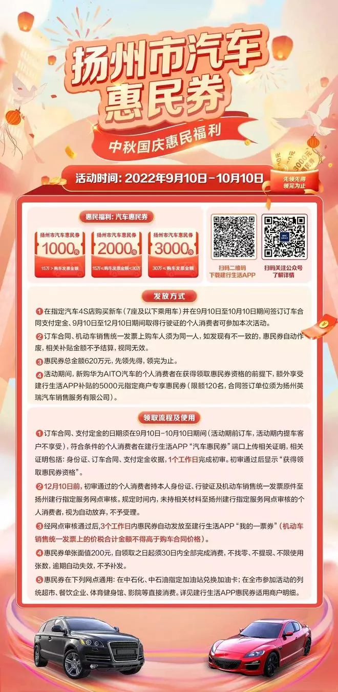 等啊等~ 终于等来了3天小长假 各位小伙伴打算怎么嗨呢? 买买买肯定少不了咯 这不,收到好消息 就赶紧来告诉大家 扬州又有惠民券可以领啦! 这一波有 汽车补贴 超市购物 餐饮住宿 文化旅游 等等 听起来太心动了有木有 快一起来看看吧~ 为有效释放消费潜力、促进消费需求,根据市委市政府决策部署,市发改委牵头制定了新一轮促进消费活动。本次促消费活动采取市、县(市、区)联动形式,在中秋、国庆“双节”期间,面向汽车、商超、餐饮、文旅等领域的个人消费者发放,发放规模1600万元。 重点来了 怎么领取和消费呢? 步骤很简单 市民群众只需下载“建行生活”APP,点击首页至活动页面领取惠民券进行消费即可。 扬州市汽车惠民券