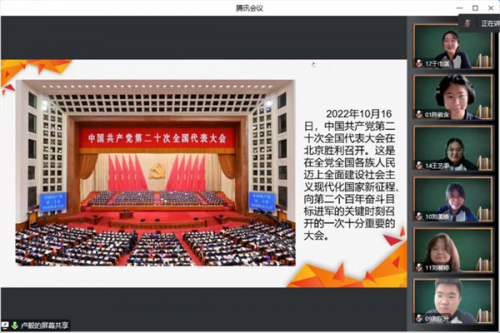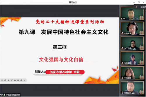 课后,党总支联合教务处通过腾讯会议的方式,组织“党的二十大精神进课堂”系列活动教学研讨。活动由政治组组长任宇航老师主持,校级领导、教学主任和全体政治组教师共同参加,针对《发展中国特色社会主义文化》一课开展评课活动。授课教师卢毅首先对此次授课情况进行总结反思,随后由政治组教研组长任宇航、教学主任李丽萍以及教学副校长耿锦对卢毅老师围绕党的二十大精神进课堂授课情况给予了高度评价。学校党总支书记聂有成评价卢毅老师的课“有理论有高度有温度,既接地气又接“天线”,是学习贯彻党的二十大精神进课堂的一次成功实践。”