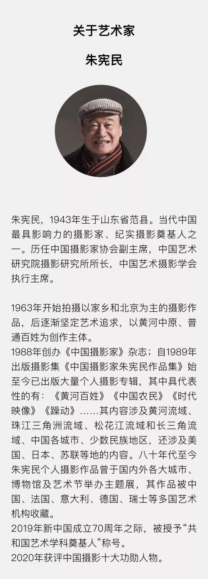 左右滑动查看部分现场照片 展览前言 岁月之光——朱宪民摄影艺术展 文/钟维兴 朱宪民,中国当代最具影响力的摄影师、纪实摄影的奠基人之一,在“圈內”大家都尊他为“朱公”、 敬他为“泰斗”。 他从20世纪60年代开始摄影,那时的中国许多摄影人还在固守职务行为,沉迷于“高大全”“红光亮” 的影像制造,而此时的他却心无旁骛地将自己的镜头专注瞄准了社会最普通的百姓,为我们留下了不同时期、不同领域的景象切片及在场证明。他先后出版了《黄河中原人》《百姓》《象形岁月》等大量作品,始终坚持现实主义的创作手法和艺术表达,不猎奇、不烧脑、更不哗众取宠,他只是让我们看到不同时期老百姓“吃什么、穿什么、家里摆设什么”,他仅仅是用他的爱与情感去表现并追忆养育了他的那片土地。他说“我被质朴的乡亲、浓郁的乡情、浓重的乡音所感动,我的手在颤抖,取景框模糊了,我猛然清醒——这才是我真正要寻找的艺术真谛!” 朱宪民拍摄的画面冷静低调但决不寡淡,时空虽为刹那,但处处直击人心。无论是贫瘠的山村,还是喧哗的市井,不管是老人还是孩童,都充满了带有黄河泥土味的生活底色与生命质感,形成了具有中国民族特性的摄影话语构建力,许多经典画面,已经成为中国摄影的集体记忆。 亨利·卡蒂埃-布列松看到他的作品后称“朱宪民先生有一双发现真理的慧眼。真理之眼永远向着生活”。 展览前言 远方的灯塔,温柔的光 文/朱天霓 我的童年、少年时代,父亲的时间和精力几乎被他所钟爱的摄影事业占满了。所有期待的周末时光,他必定凌晨出发,或出差或往来于北京的各种集市、街道、胡同拍摄;平日父亲的教育正统,对我的日常要求近乎严苛,这些要求被不善言辞的父亲以最简短的语言表达出来,女儿的叛逆、与父亲的冲突在所难免。 我的青年时代,离家远行。临行前,母亲帮我熨平了行李箱中每一件衣服,父亲默默在行李箱中放入一本自己的摄影集和一封短信,“女儿,有一天你看懂了这些照片,便会理解你的父亲......” 多年以后的今天,我开始整理父亲的作品。除去那些常发表和展览的照片外,竟还有那么多打动我的内容。父亲镜头里,这些普通人的生活轨迹,构成了当代中国人的形象符号和视觉历史。这些普通人身上所闪现的人性之光:善良、恒定、实在、在艰难岁月中呈现的乐观豁达,正是我们民族传承的最宝贵的基因。 我常凝视着这些来自祖国各地的个体和群体面孔,他们会幻化成为我的亲人、朋友、邻居和擦肩而过的路人,就在我身边;在他们之中,我更真切的看到自己。这一刻我能感受到镜头后面父亲的情感和理念,他的热爱、同情、关注、愤怒、悲悯......我想,这些作品不仅属于父亲个人,同样属于我们家庭几十年缺失的时光,属于照片中所记录的每一位普通人,更属于我们的时代和民族。 二十多年过去了,不知在父亲心中女儿是否已读懂他的作品,女儿是否已理解他深沉的爱。我已人到中年,与父亲与自己早已和解,但有些时候还会感觉生活如同独自在黑夜的海面航行。在迷茫与孤寂的时刻,蓦然看到远方的灯塔,温柔的光洒落海面与心间,我知道顺着这道光终将抵达彼岸。这光于我,便是父亲。