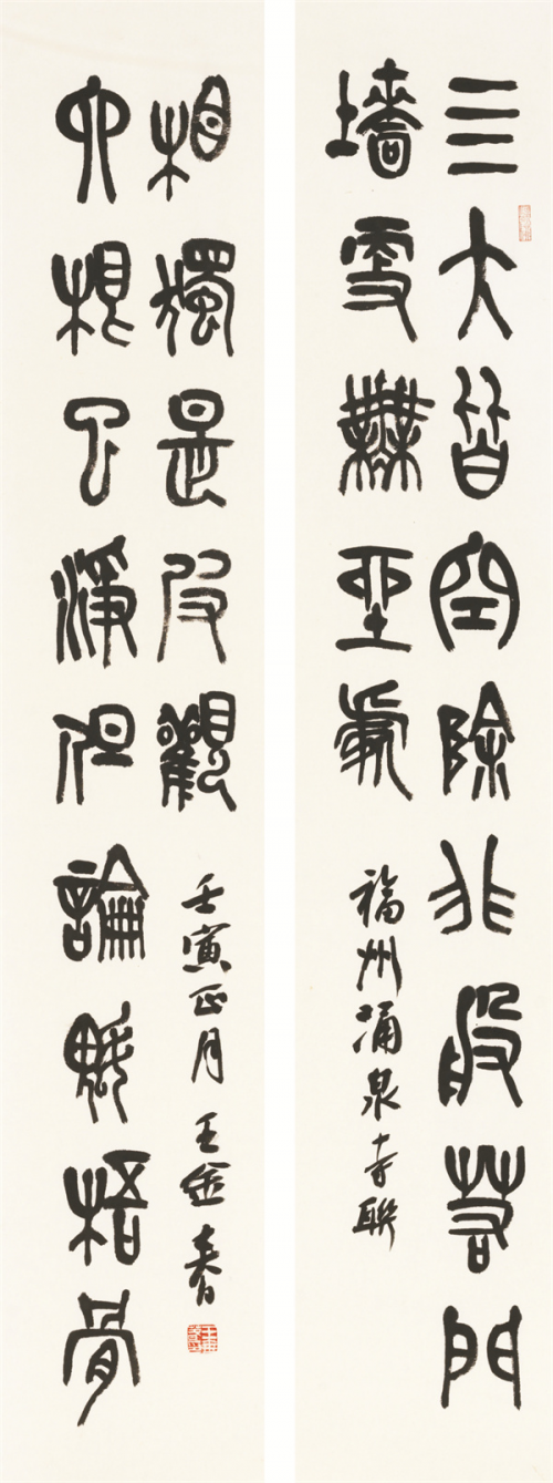 我与王金春先生结缘较早,多次应邀观赏他的书法作品展,深知他出众的书法造诣。他真、草、行、隶、篆五体皆习,五体书作均入展过全国大展,是当代书法家中为数不多兼擅五体者之一。总体而言,金春先生喜欢古拙而厚重的艺术趣味,小楷追慕钟繇,行书筑基米元章,篆书心仪吴昌硕,隶书得趣《张迁碑》,当然,现在的作品已能诸体相融,带有鲜明的自家风貌。