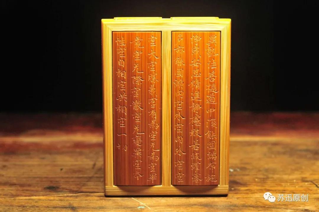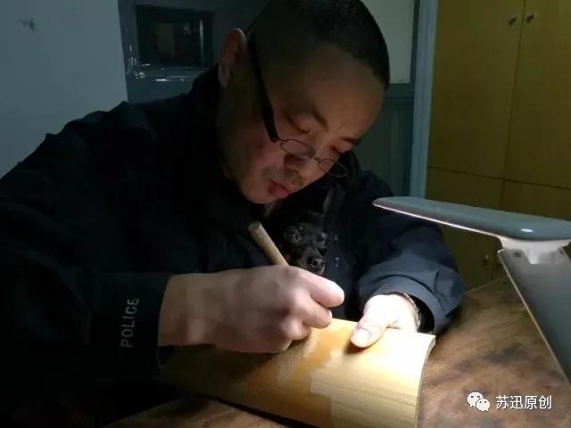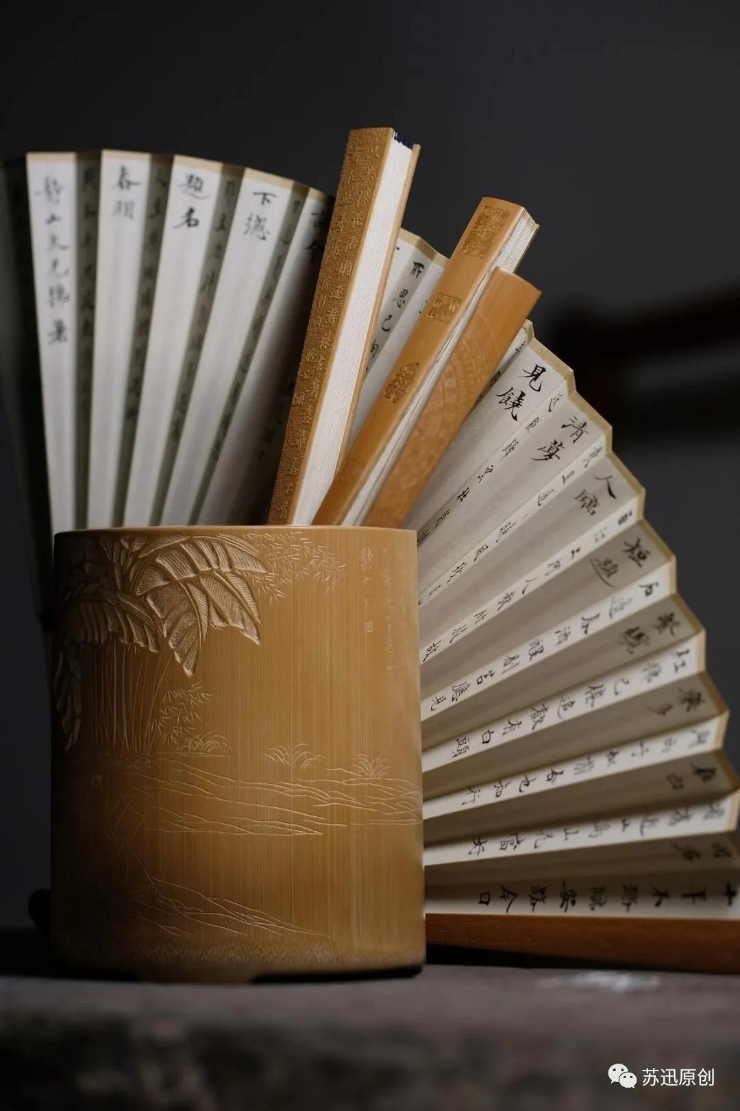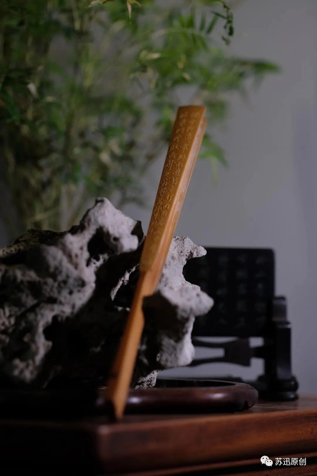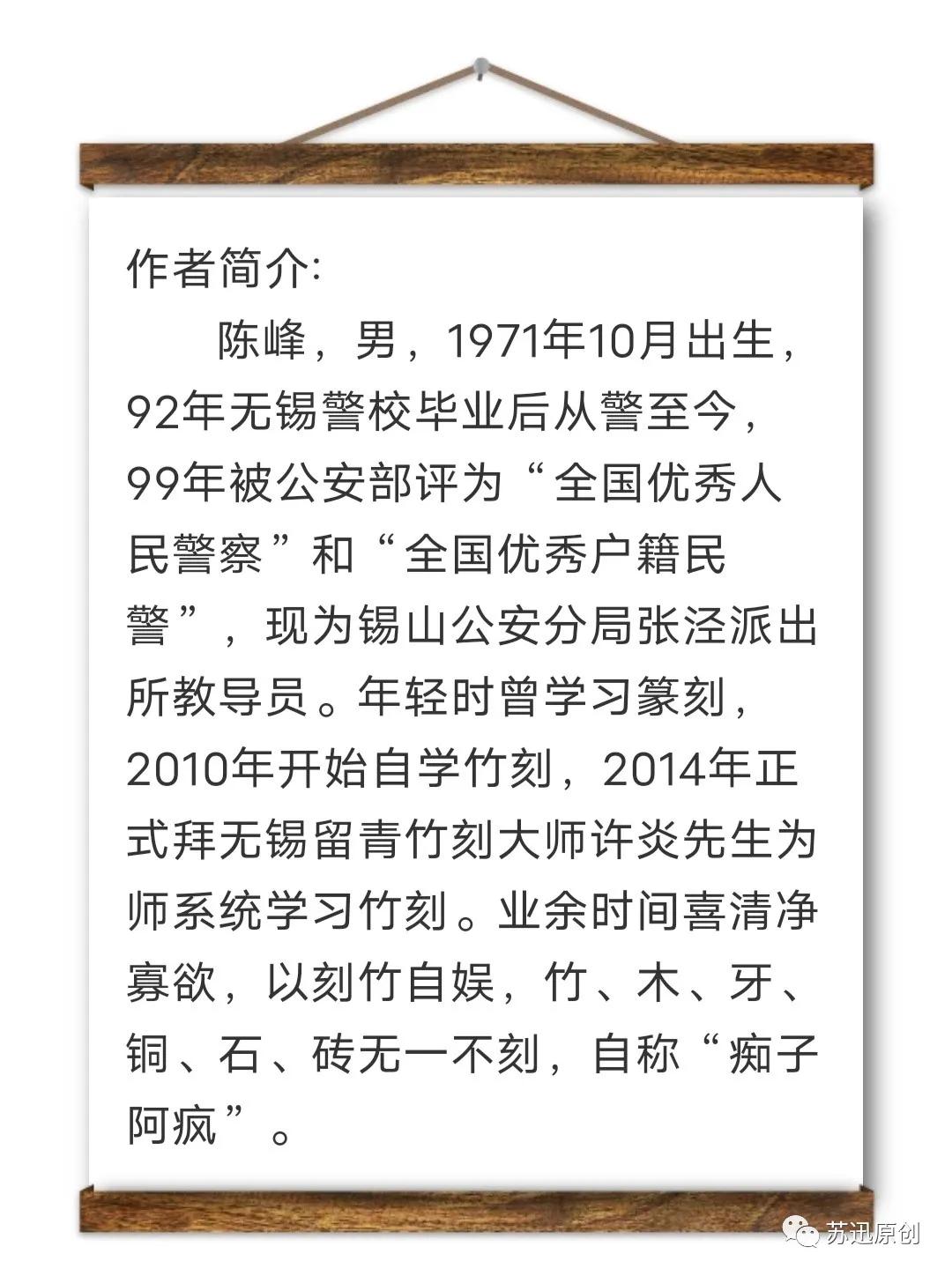 无锡竹刻家陈峰小记 苏迅 陈峰全身心投入竹刻艺术的时间不算长,大概至今有五年左右时间。那时他偶尔读到一篇我写嘉定竹刻名家的文章,通过朋友加了微信,我们从此便成了“朋友”。我在微信里看着他如醉如痴,在工作之余夜深人静时候一刻就是几个钟头,每逢休息天则操刀劳作的时间坚持更久。与之相对应的是,他经常可以一天刻完一副扇骨。这样的速度是惊人的,也不很符合竹刻慢工细活的技艺特点,我劝他悠着点儿,不要急。他则总是说,年纪不饶人,上手晚了,得抓紧时间努力往前赶呀。我们难得见面,偶尔在微信里聊聊,他接触竹刻其实已经十余年时间,只是最近的几年才集中精力专注于此。