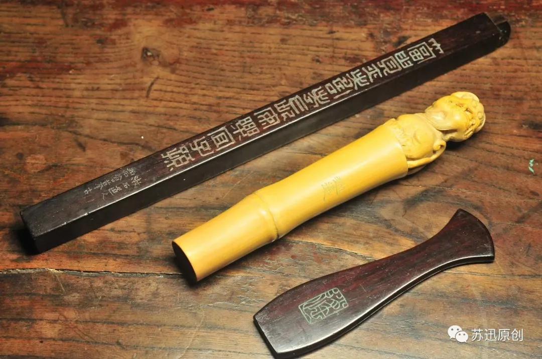 陈峰居然是位警察,那时他还在一个基层派出所任职,职业工作的繁巨可想而知。他以知天命的年龄,又长期患有腰椎等疾病,孜孜于刻刀和竹片之间,僵坐于冷板凳上灯光之下,那是要多么大的热情和毅力呢。他却说,只有一个人静下心来拿起刻刀,内心才是充盈的,那简直是一种享受。他不大顾及我奉劝他放缓速度的忠告,还是坚持着那种速度和强度,我是有一点帮他担心的。这隐忧其实还不仅仅是为他的体能和健康,主要是对于这样一门工艺美术要从技术层面跃升到艺术层面,很多时候,差异只在微妙的细节之处,速度是很为关键的一个要素。而制作要演化为创作,一味提速和增加强度可能消磨艺术触觉,也会消解艺术品质。我一直认为,高级的艺术品乃至工艺品,需要包含一种特殊的缓慢的速度感。倚马可待、一挥而就虽然能够体现灵感乍现的异彩瞬间,但是,那绝对不是艺术的常态。 我们结识之后一年余,在他的工作室见过一面,上手不少作品,比之初识时候他的镌刻技艺日渐纯熟,作品精度和细度已经不可同日而语。再过一年左右,我去他新搬的工作室,作品更多,他对墨稿的要求也越来越高,苏州宋世平、黄泊云,无锡郁枫、朱寒光、沈子淳,绍兴王家林(即厂)、广东焦磊(豚父)等都为他在竹木器上创作稿子,他已经是在追求线条的表现力、刀法的多样性和画面的艺术感。他刻扇骨、刻臂搁、刻镇纸、刻虫盒、刻竹鞭、刻书签……凡是好玩的东西他都刻,都不肯放过,很多东西经他的手刻过,就更好玩。表现技法既有浅刻、留青,也有陷地、刻簧,尤其在阴文浅刻上他花了大力气,亦步亦趋遵循着先贤的足迹肆力追摩。虽然华发上鬓,他倒是没有丝毫的门户之见,更没有因循守旧习气,不仅向无锡乡贤前辈竹刻名家学习,也借鉴金西厓等民国时期南北各派大家的技法,更为难能可贵的是,他不断向技艺高超的当世好手请益受教,哪怕对方比他小了足足十几二十岁,他也能者为师,甚至诚心诚意提出愿意拜师学艺。