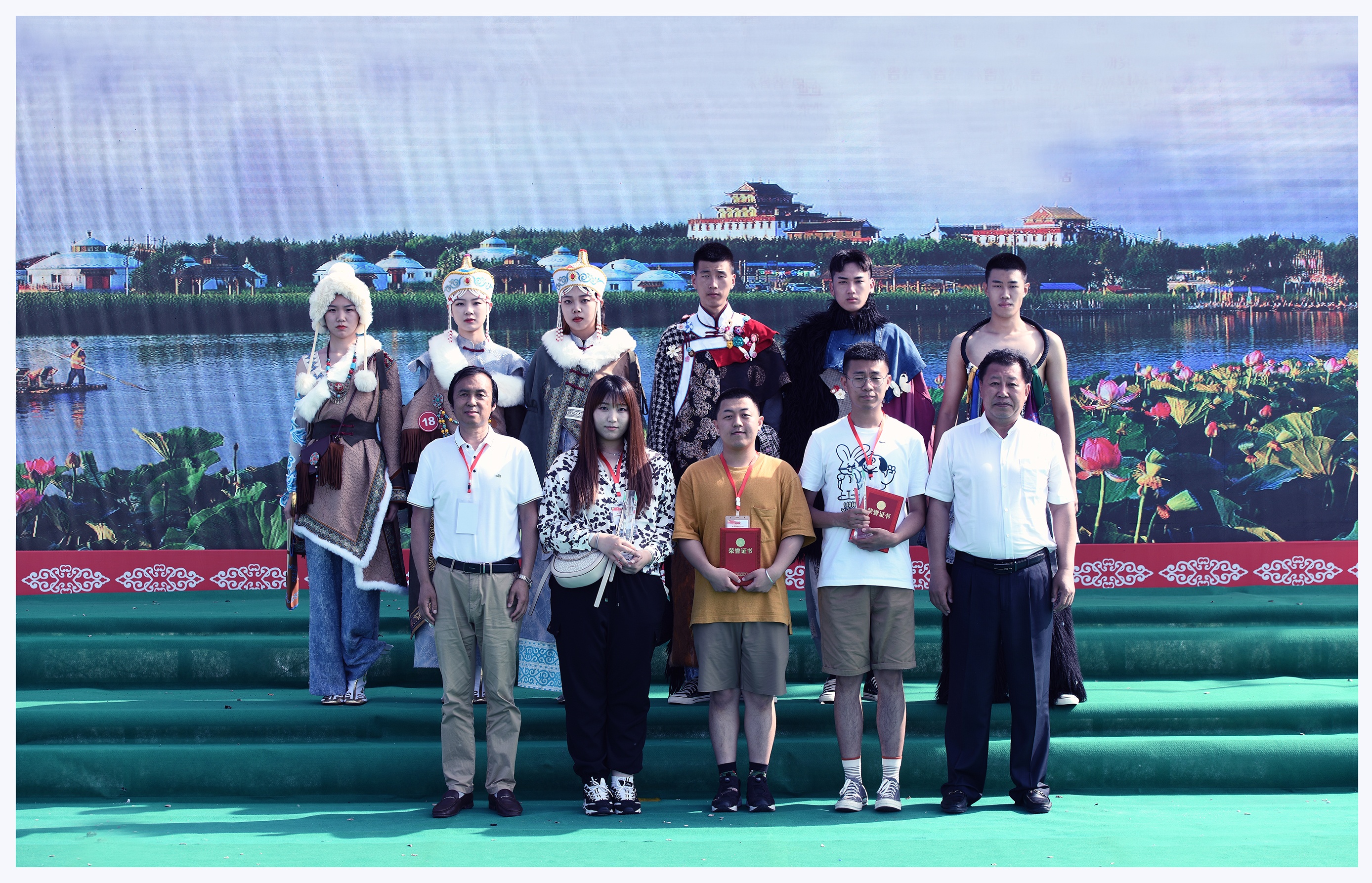 领导嘉宾与参赛选手合影留念 开幕式由前郭县政协副主席额尔敦尼主持,松原市民族事务委员会主任刘红霞、吉林省服装设计师协会执行会长兼秘书长刘克力出席并分别致辞,吉林省民族事务委员会副主任金明哲出席开幕式并宣布文化节开幕,查干湖旅游经济开发区管委会副主任高洪忱、东北电力大学艺术学院党委书记张晓参加了开幕式活动。